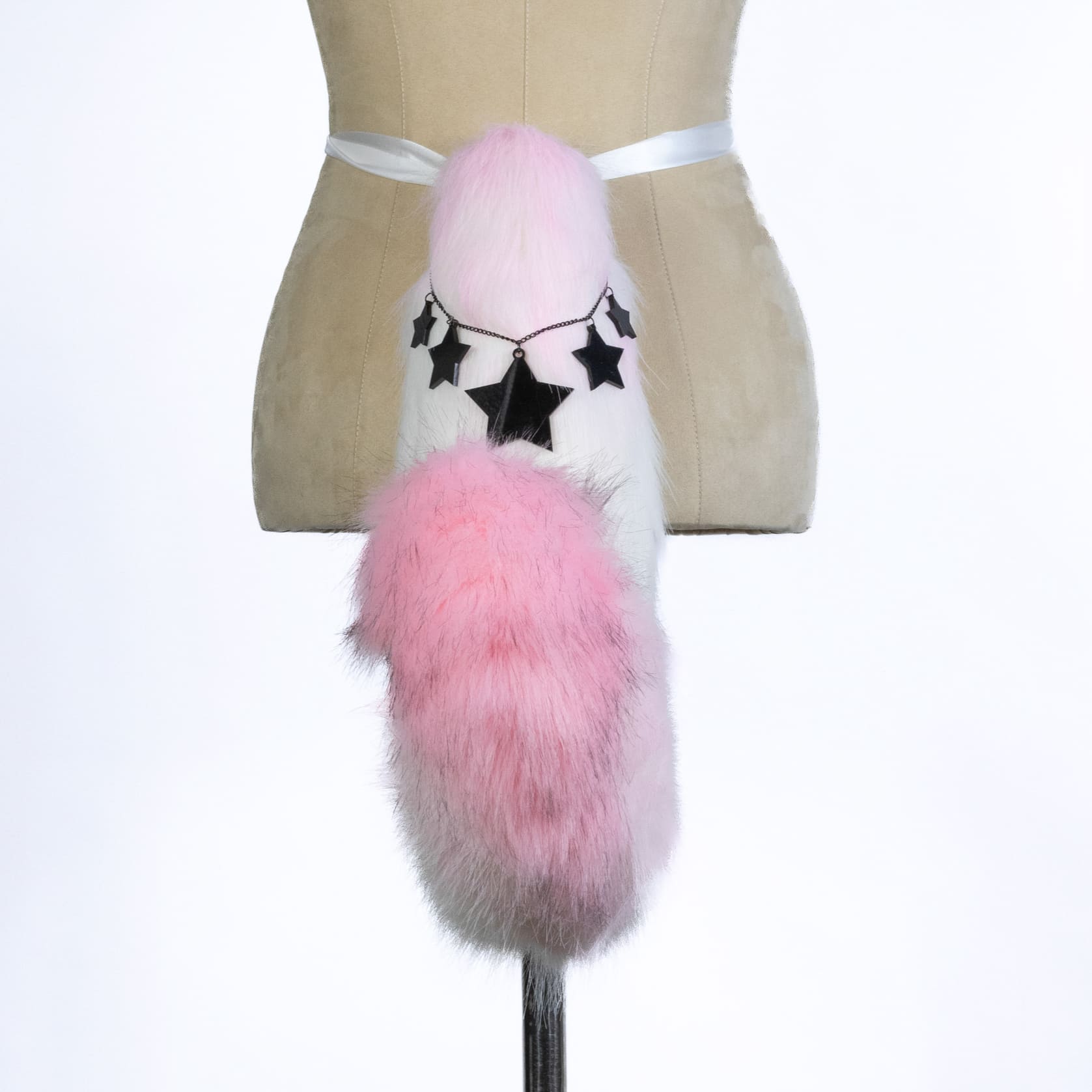 Pink puppy shaped tail, approximately 22 inches, decorated with chain and plastic star pendants. Tail is attached by an elastic belt loop and a doublesided ribbon. Made of luxury quality faux fur.