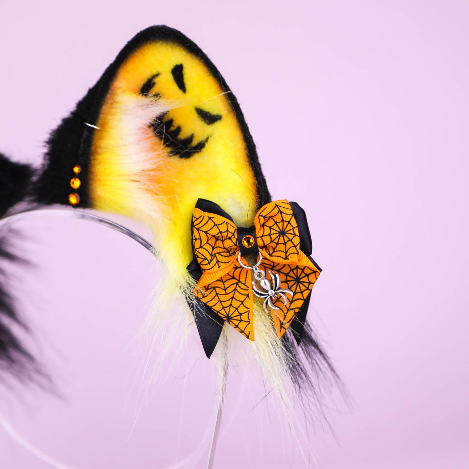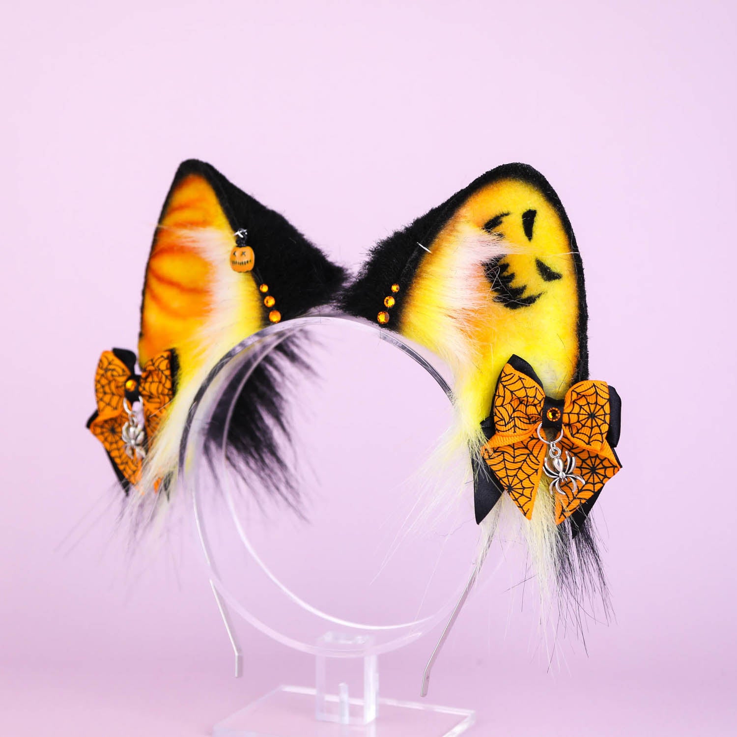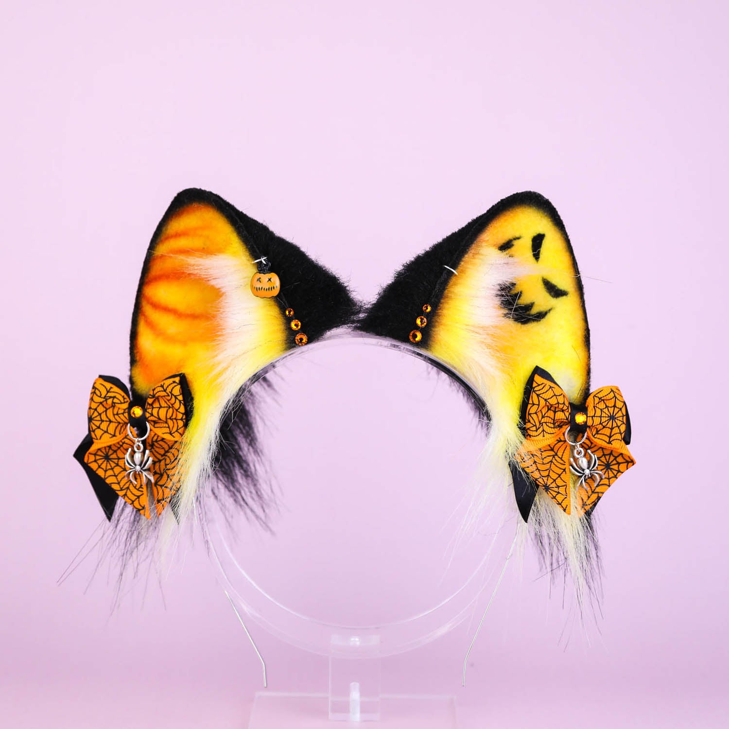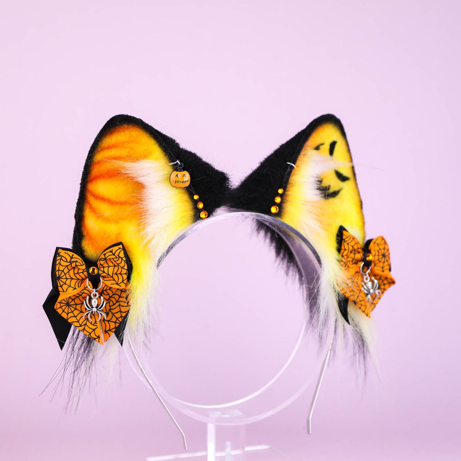 Ears are fully wired and posable on a metal headband. Approximately 3 inches tall. We use luxury quality faux fur and crystals. Ears are decorated with piercing hoops, charms and removable bows on little alligator clips with pendants.