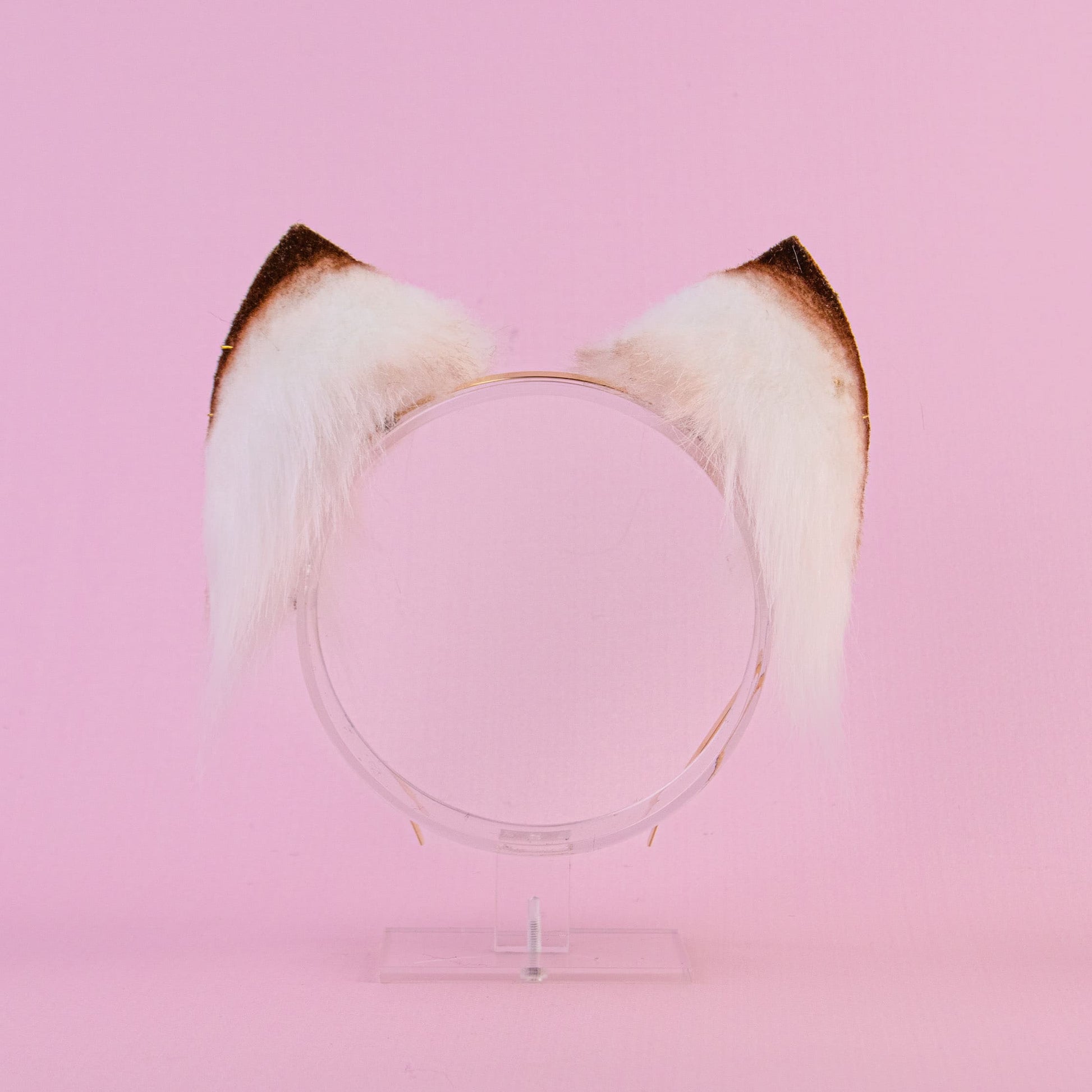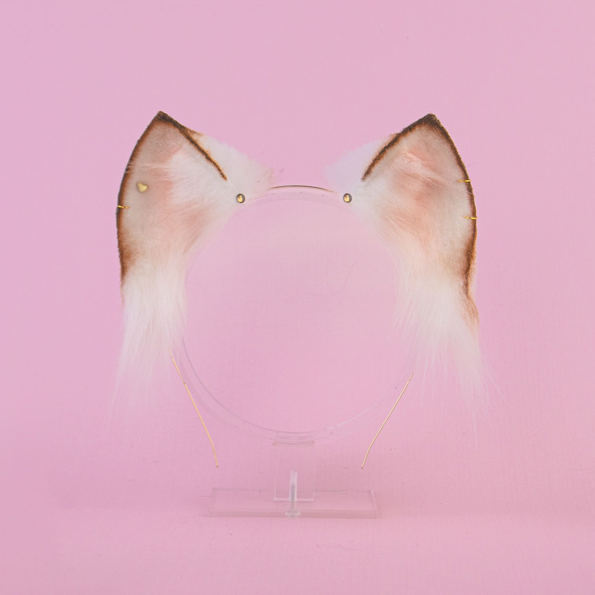 Beige-brown kitten shaped ears, approximately 2,5 inches, decorated with airbrushing, piercing, rhinestones. Ears are fully wired and posable on a metal headband. Made of luxury quality faux fur and crystals.