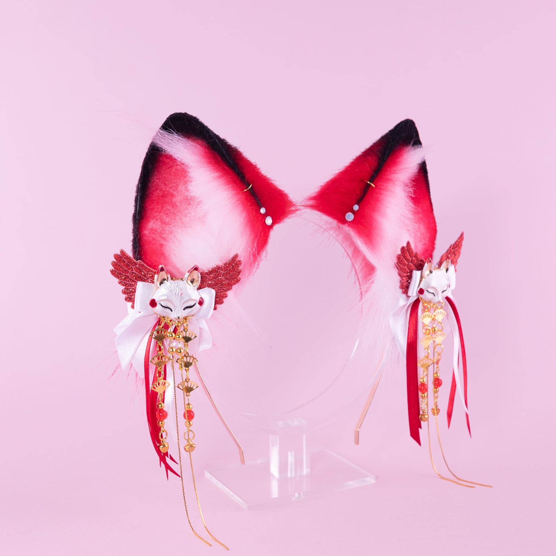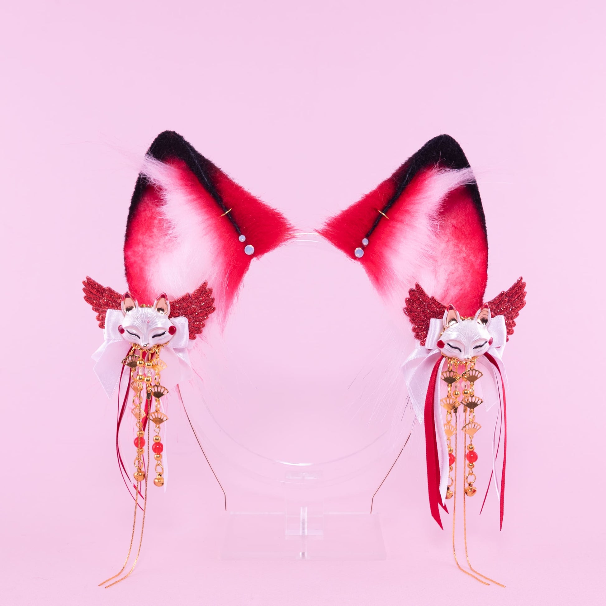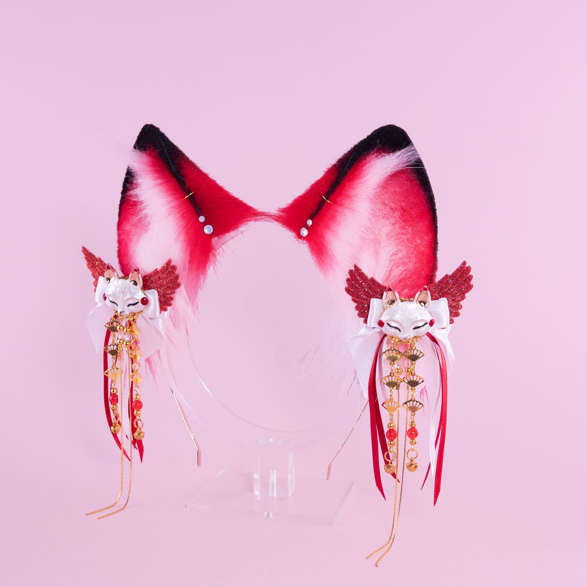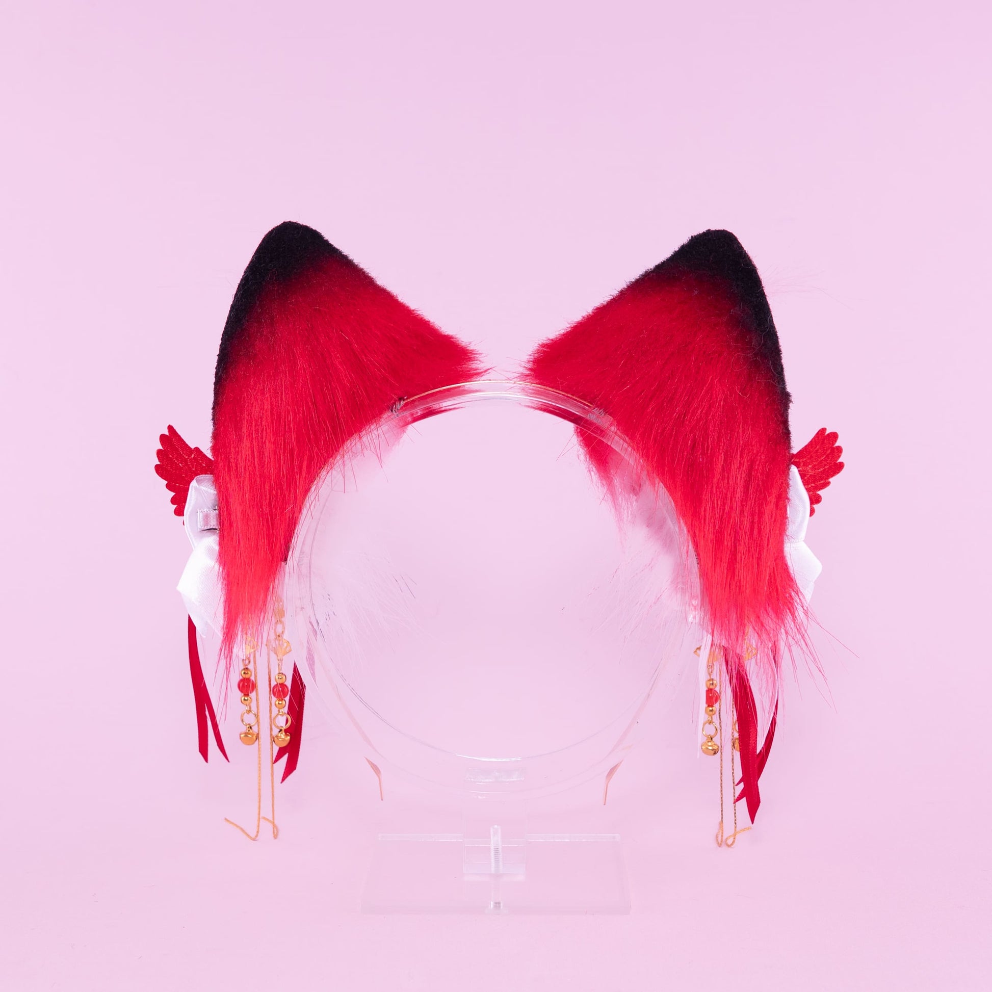 Black and red fox shaped ears, approximately 3,5 inches, decorated with airbrushing, rhinestones and winged bows with themed pins. Ears are fully wired and posable on a metal headband. Made of luxury quality faux fur.