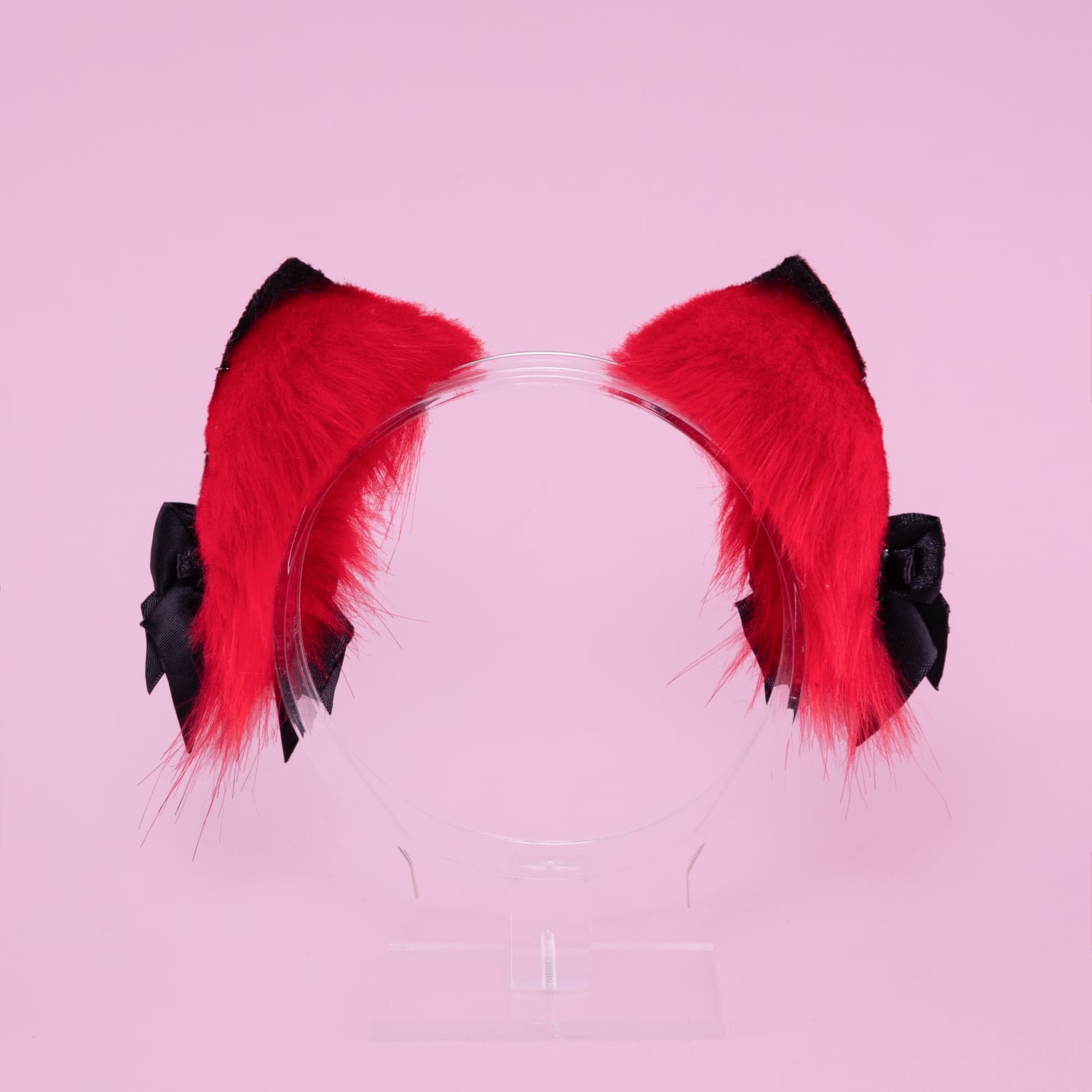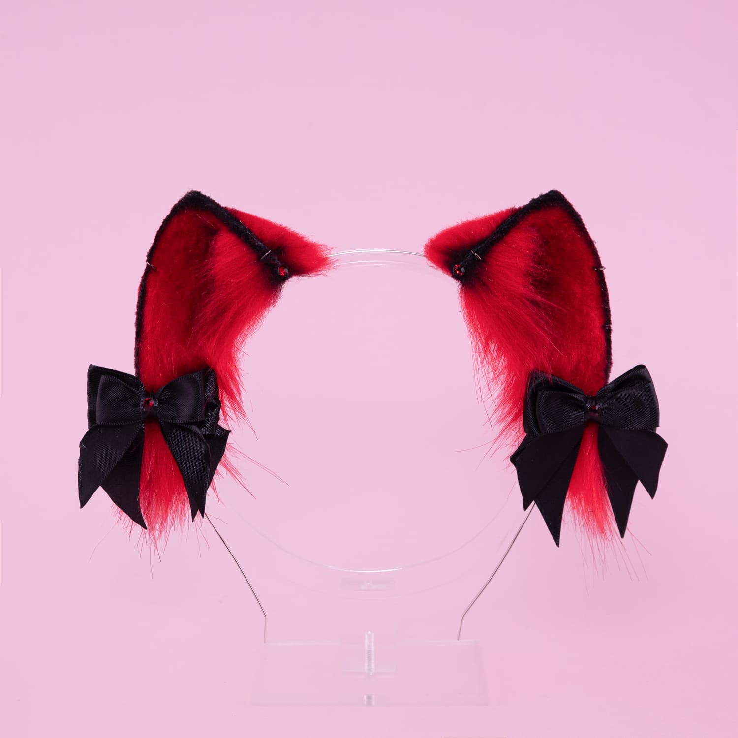 Red kitten shaped ears, approximately 2 inches, decorated with rhinestones, metal hoops and cute bows. Ears are fully wired and posable on a metal headband. Made of luxury quality faux fur and crystals.