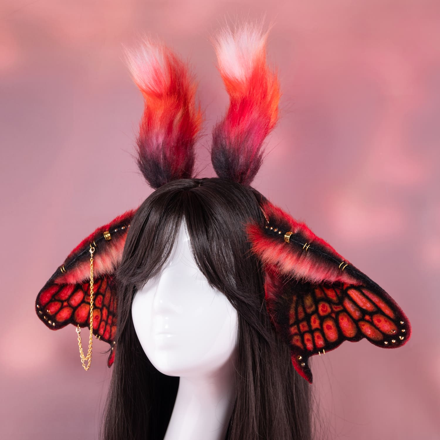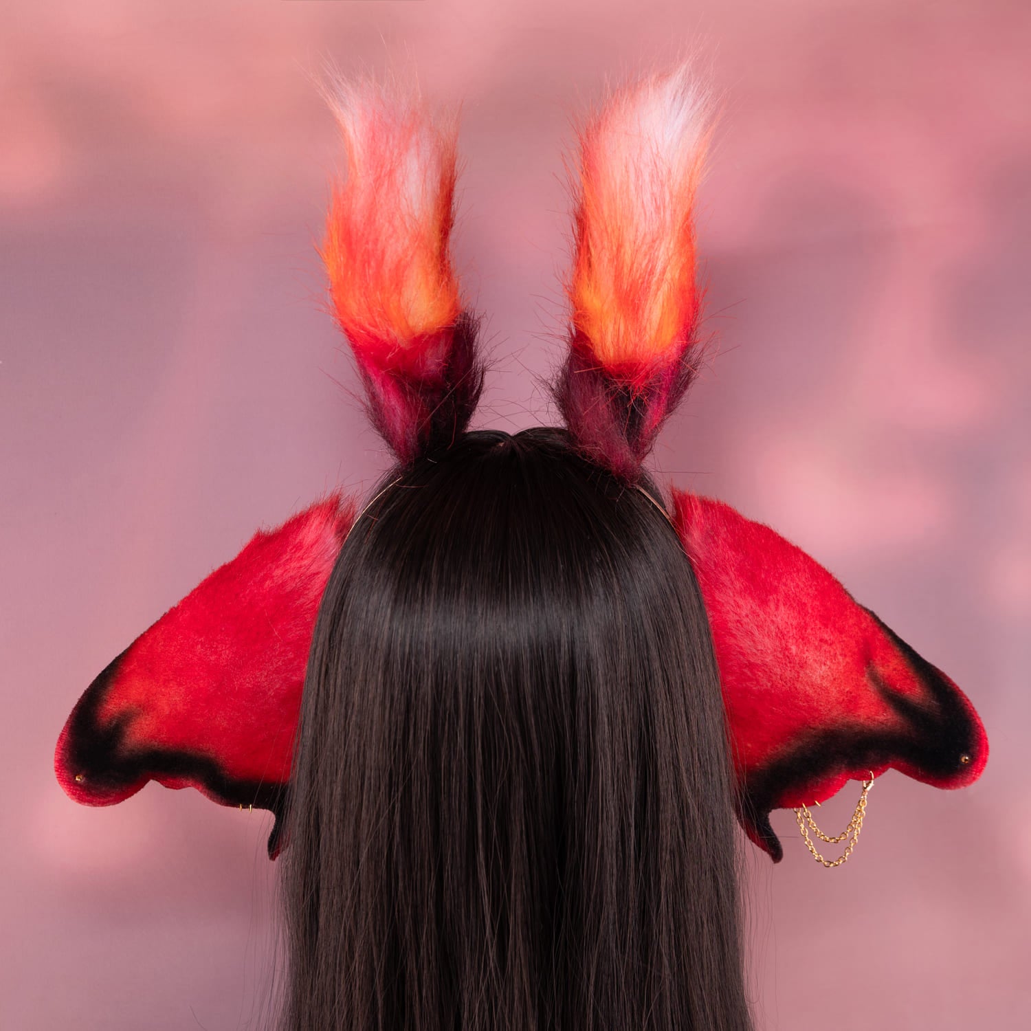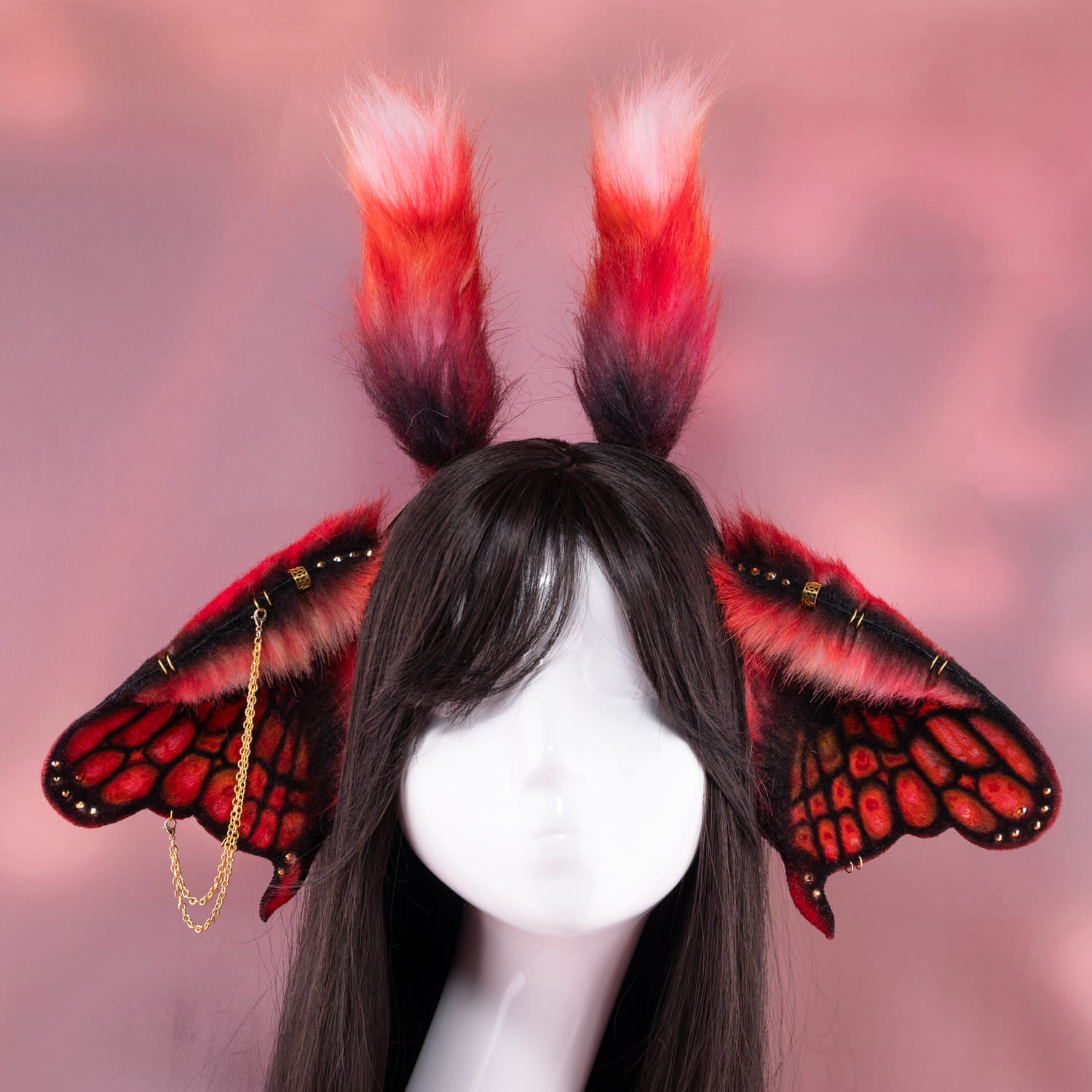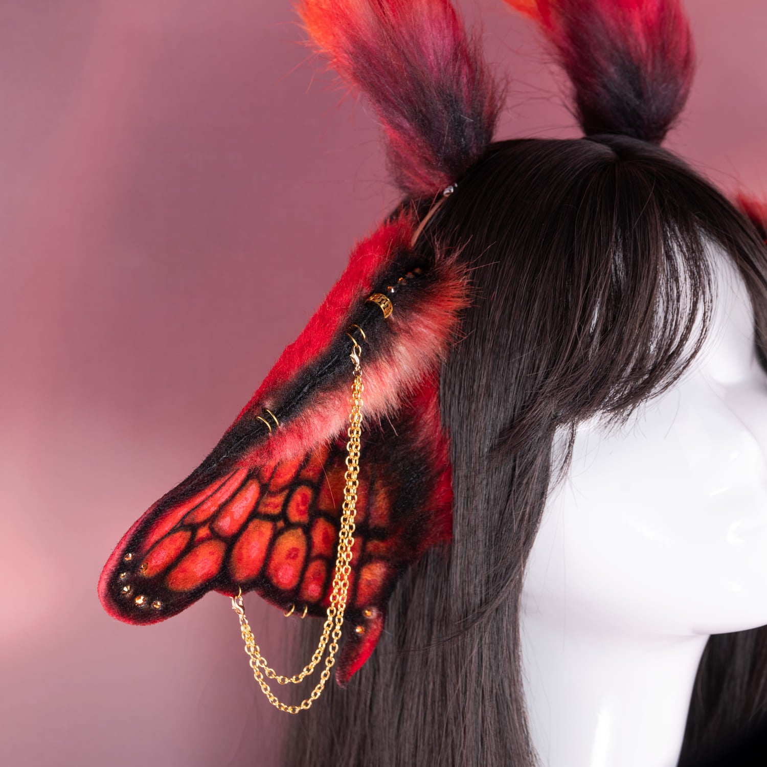 Red ears, approximately 3.5 inches, decorated with metal hoops, rhinestones, airbrushing, chains and cute fluffy horns. Ears are fully wired and posable on a metal headband. Made of luxury quality faux fur.