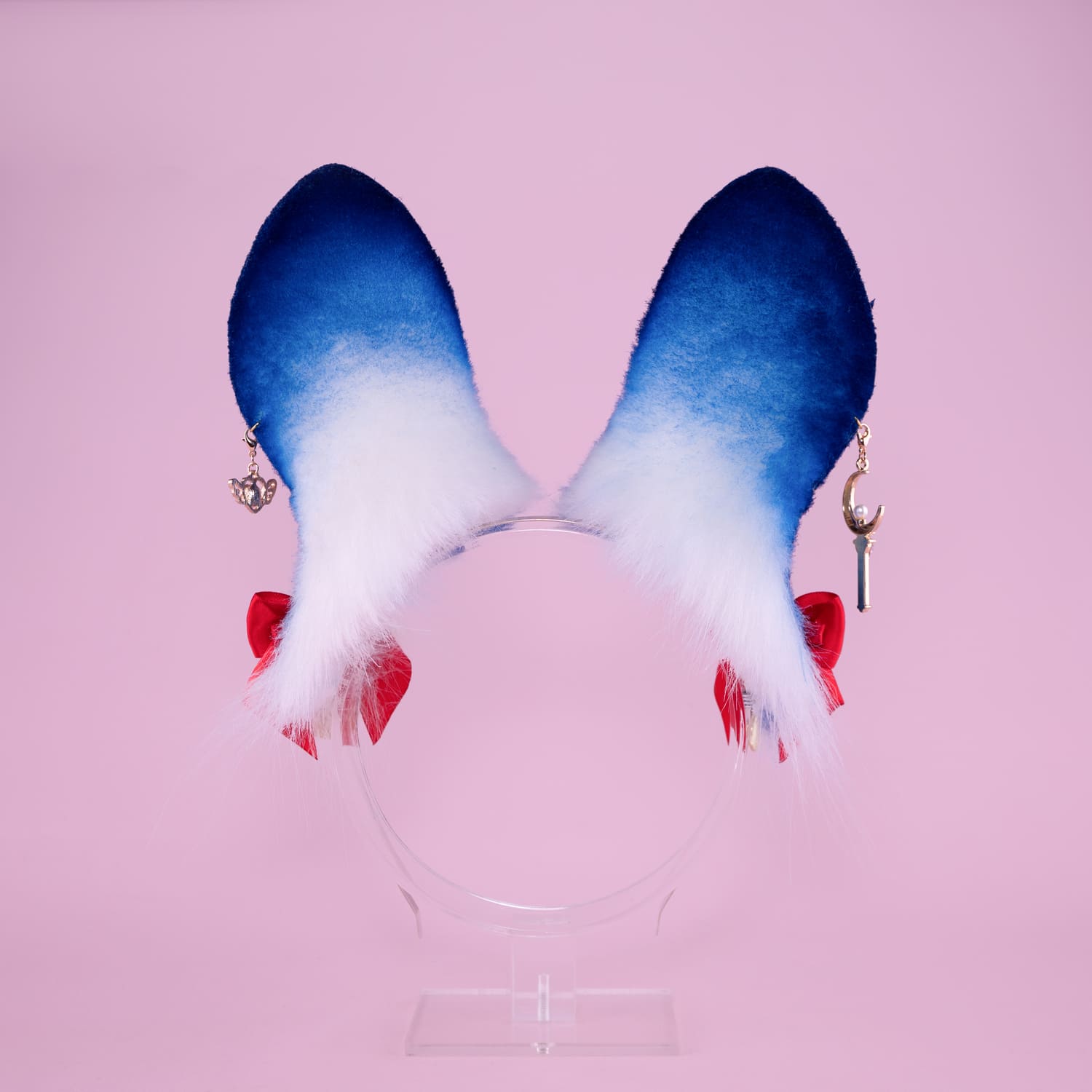 Blue bunny ears, approximately 4 inches tall, decorated with airbrushing, piercing hoops, rhinestones, charms and removable bows on little alligator clips with pendants. Ears are fully wired and posable on a metal headband. Made of luxury quality faux fur and crystals.