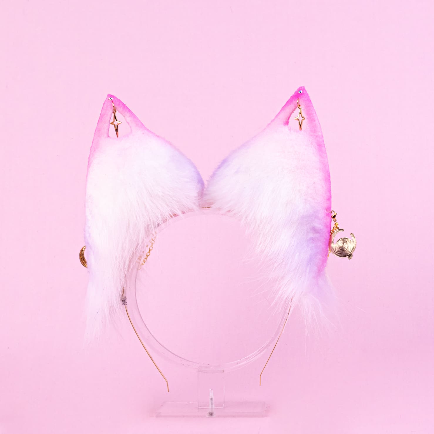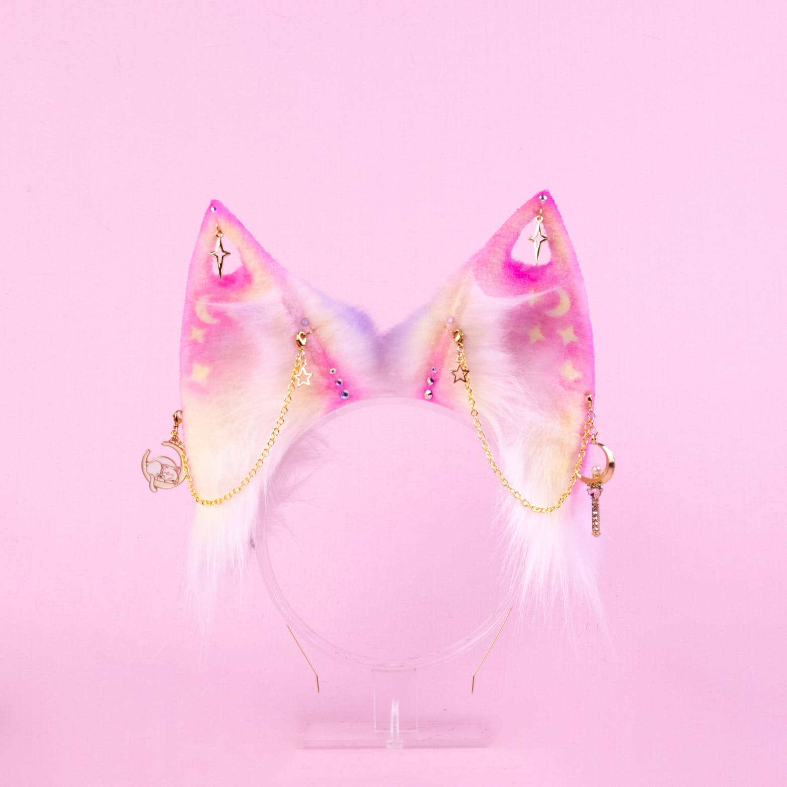 Pink foxy ears, approximately 4.5 inches, decorated with airbrushing, piercing, rhinestones, chains and themed pendants. Ears are fully wired and posable on a metal headband. Made of luxury quality faux fur and crystals.