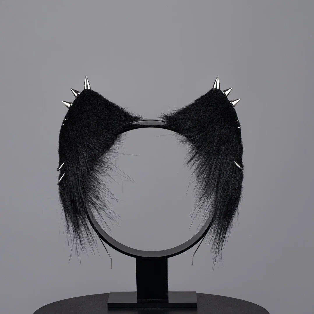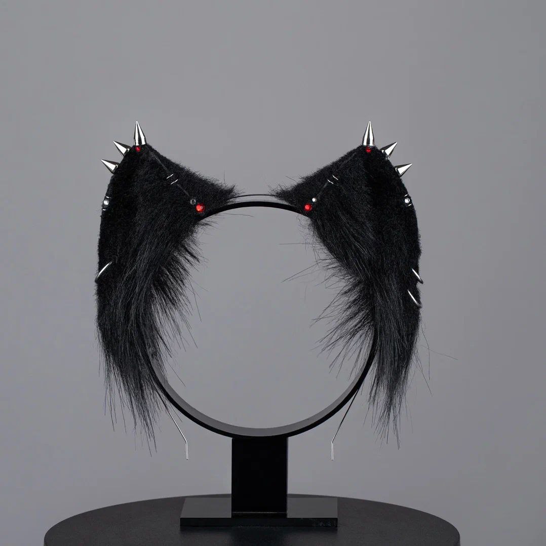 Black cat shaped ears, approximately 2 inches, decorated with airbrushing, piercing, spikes. Ears are fully wired and posable on a metal headband. Made of luxury quality faux fur.