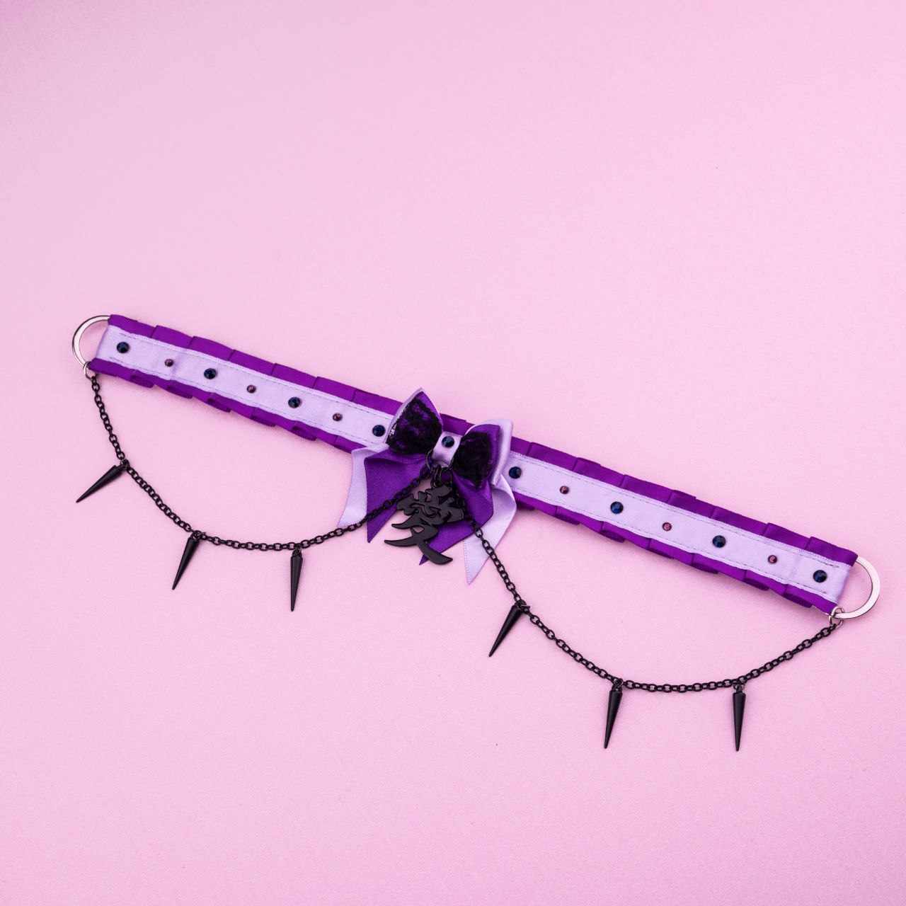 Violet pleated choker with rhinestone accents, chains, decorative spikes and a bow with a pendant.