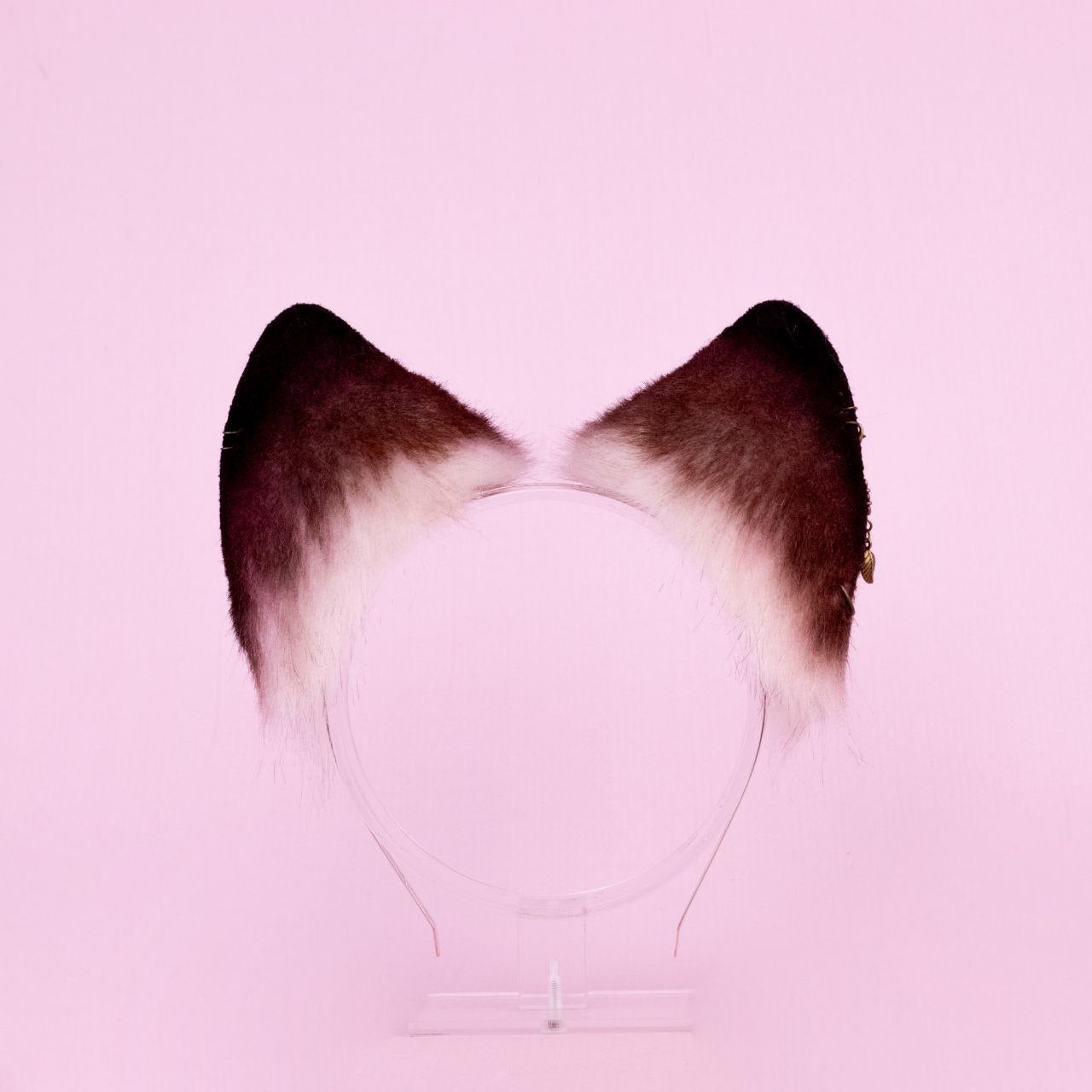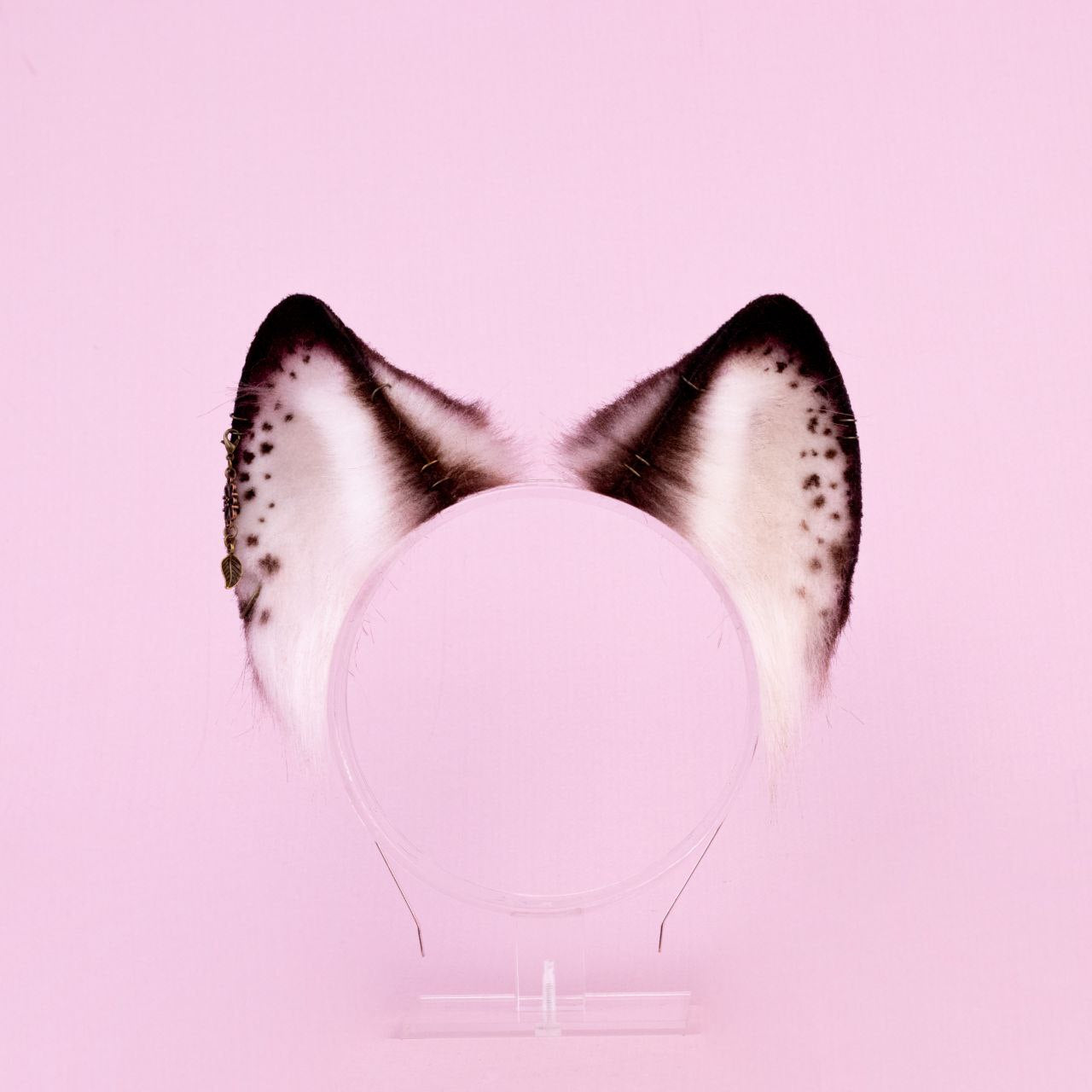 White and brown foxy shaped ears, approximately 3 inches, decorated with airbrushing, piercing and pendant. Ears are fully wired and posable on a metal headband. Made of luxury quality faux fur.