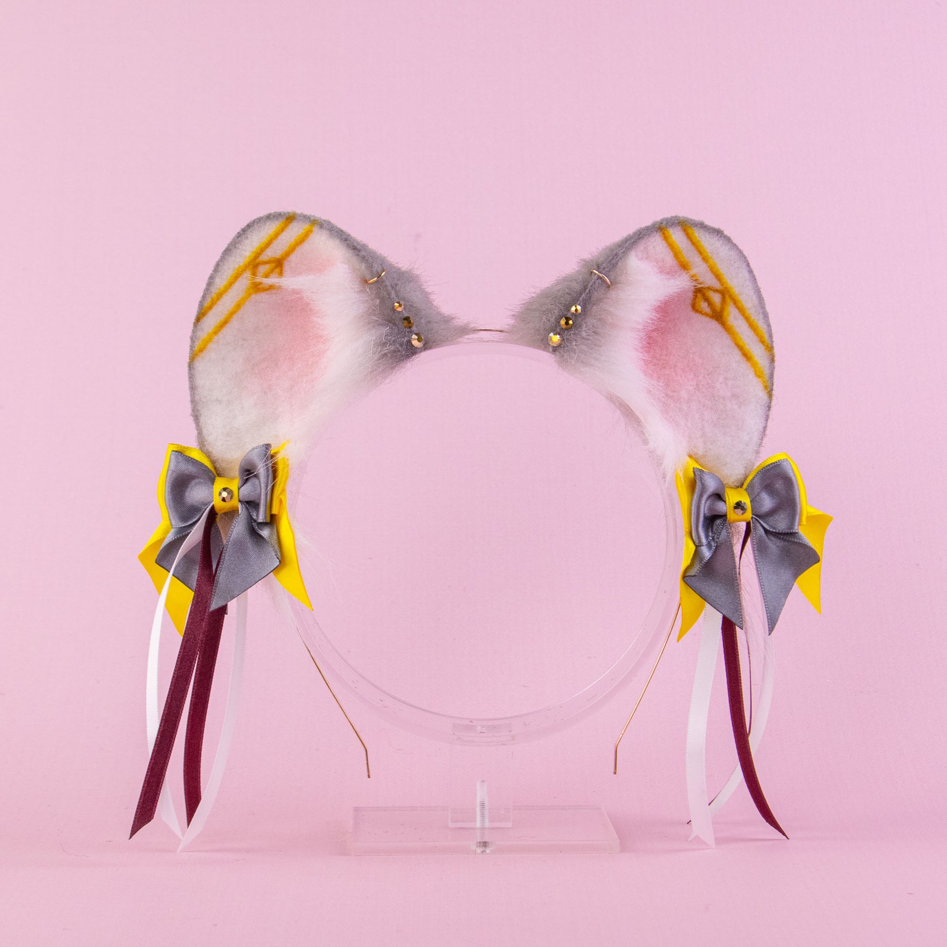 Ears are fully wired and posable on a metal headband. Approximately 2,5 inches tall. We use luxury quality faux fur and crystals. Ears are decorated with airbrushing, rhinestones, piercing hoops and removable bows on little alligator clips.