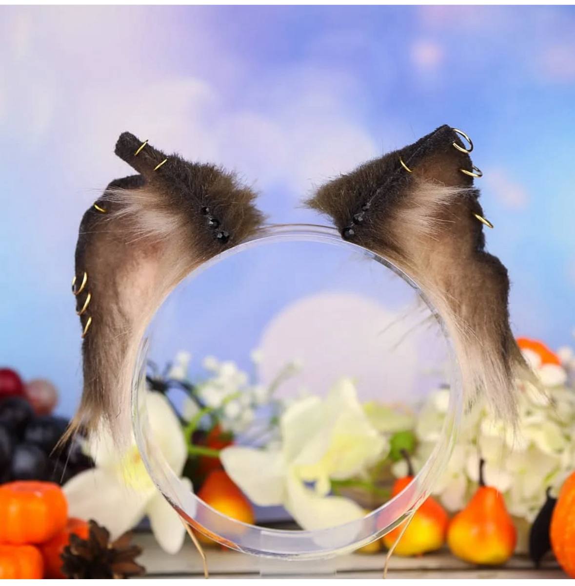 Cat shaped ears, approximately 2.25 inches. Ears are fully wired and posable on a metal headband. Made of luxury quality faux fur.