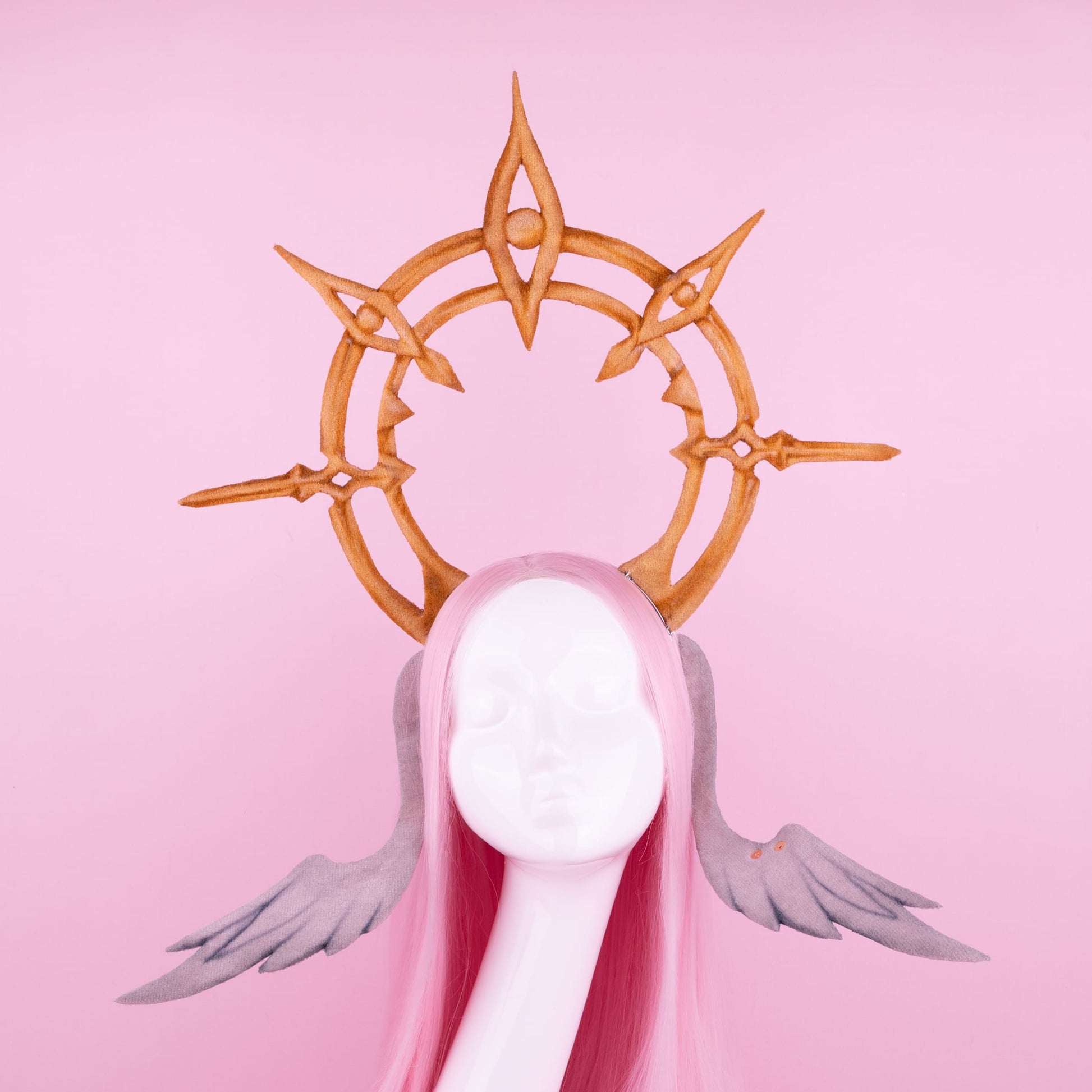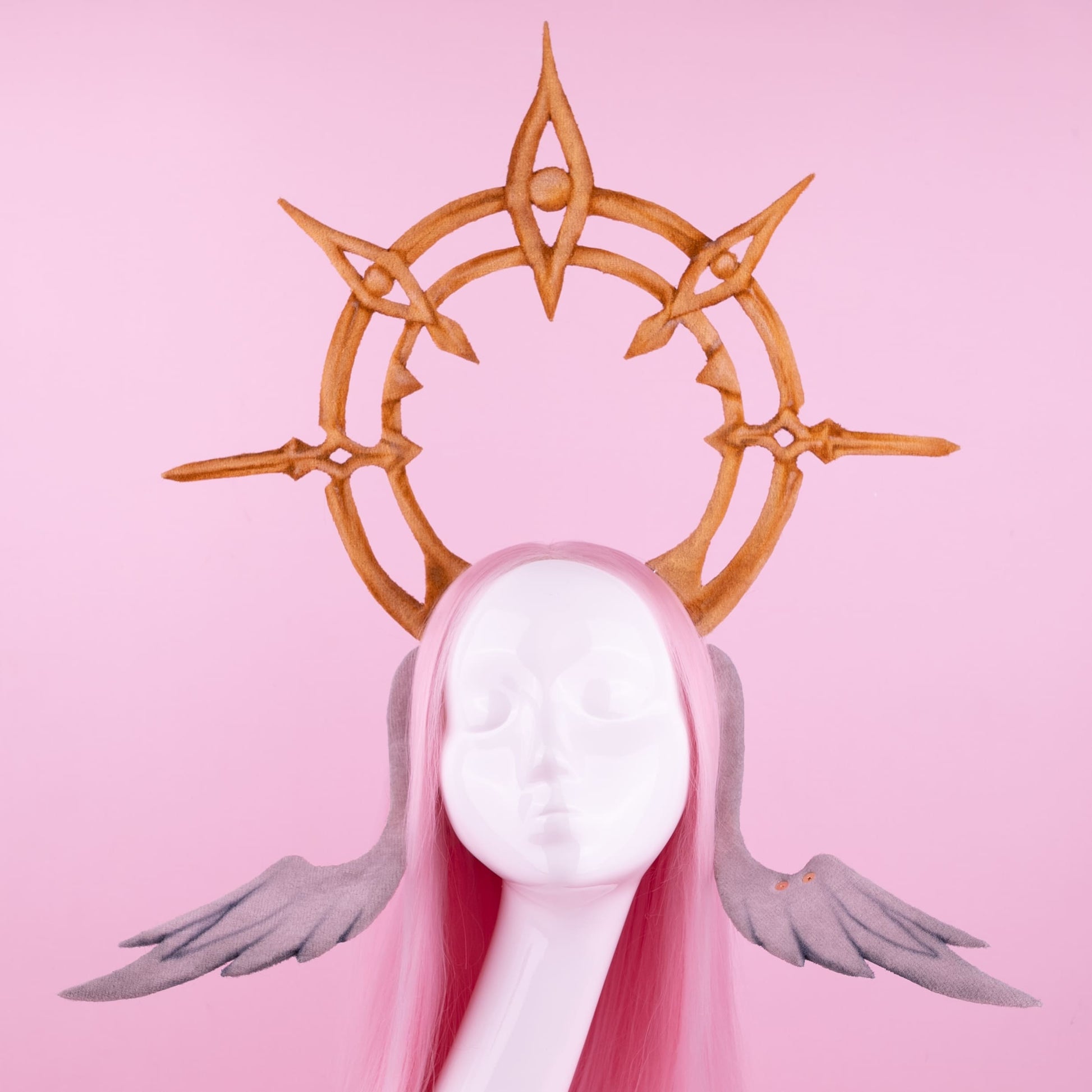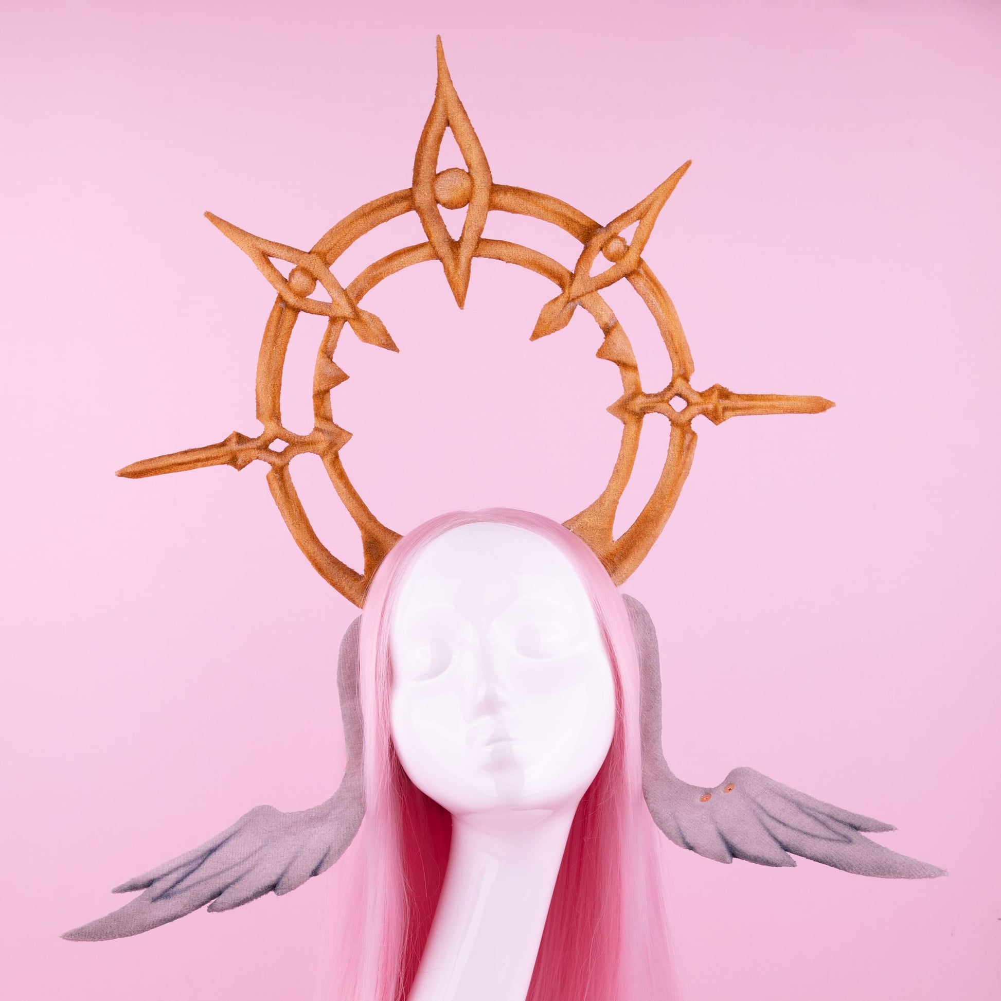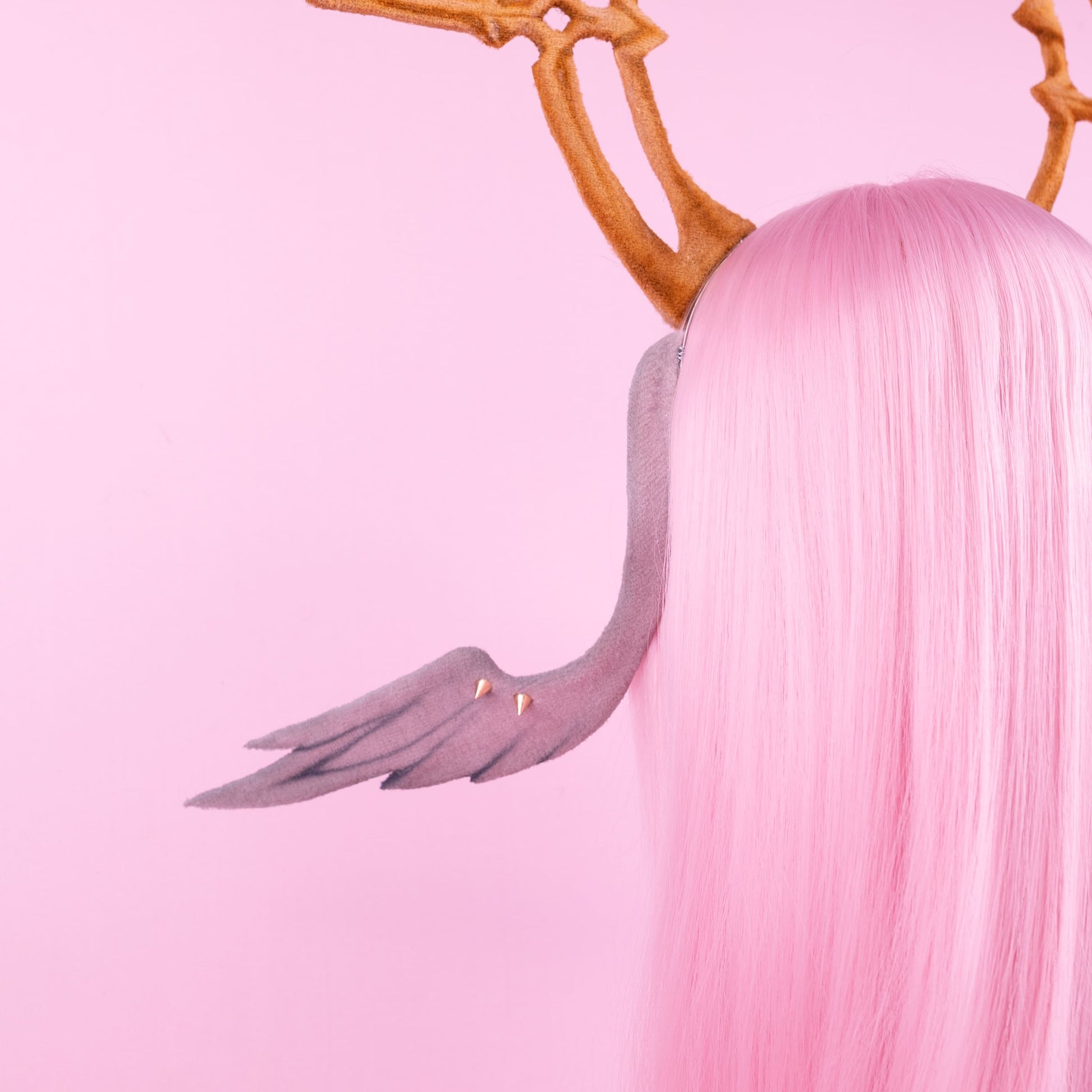 Grey ears, approximately 4 inches, decorated with airbrushing. Ears are fully wired and posable on a metal headband. Removable golden halo headband, approximately 9 inches, decorated with airbrushing. Both pieces are made of luxury quality faux fur.