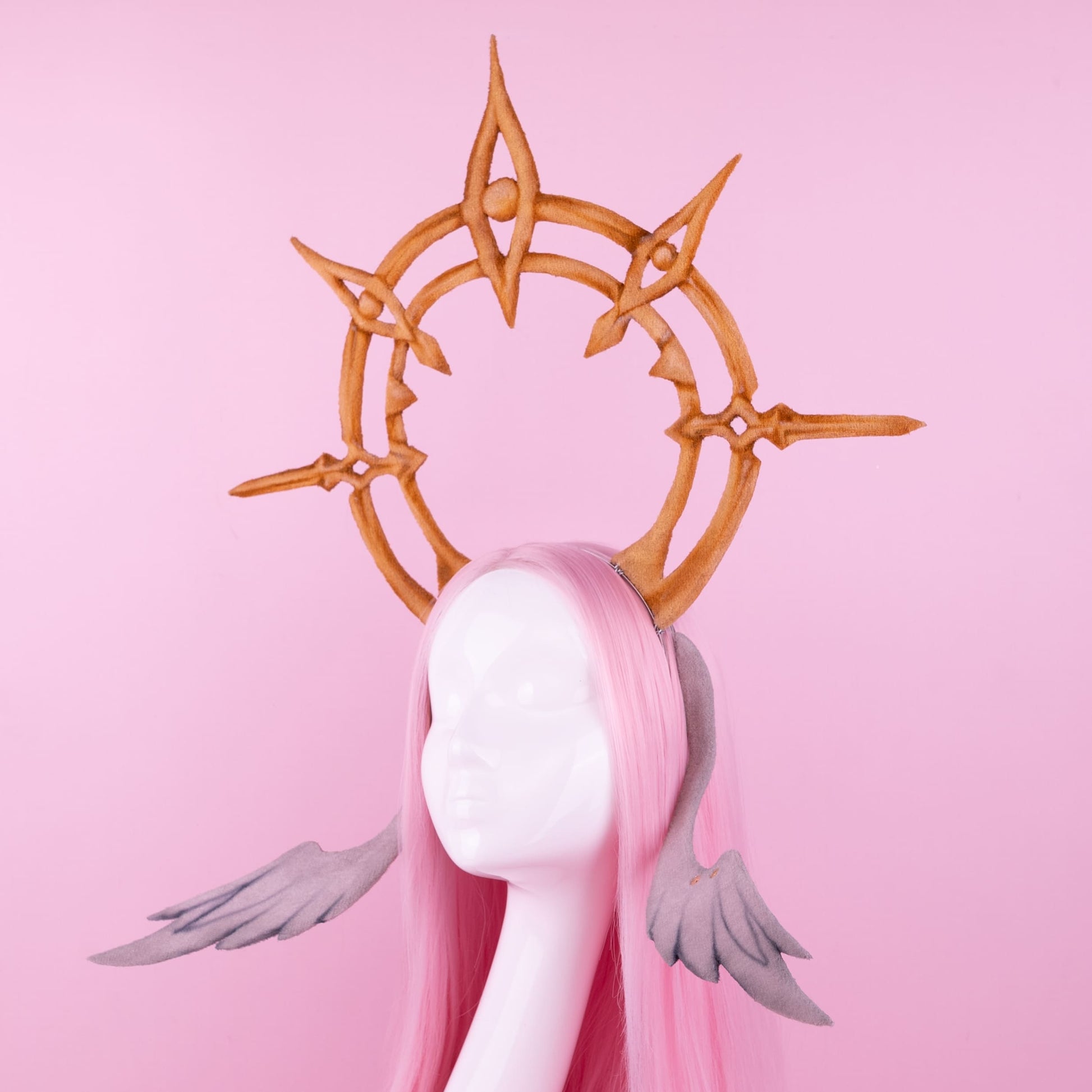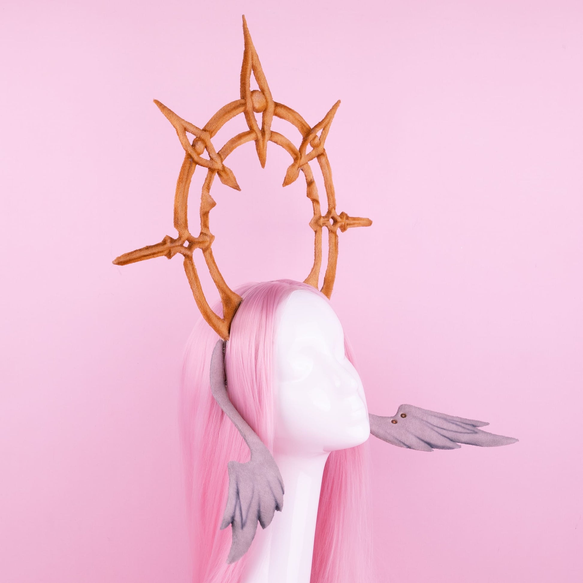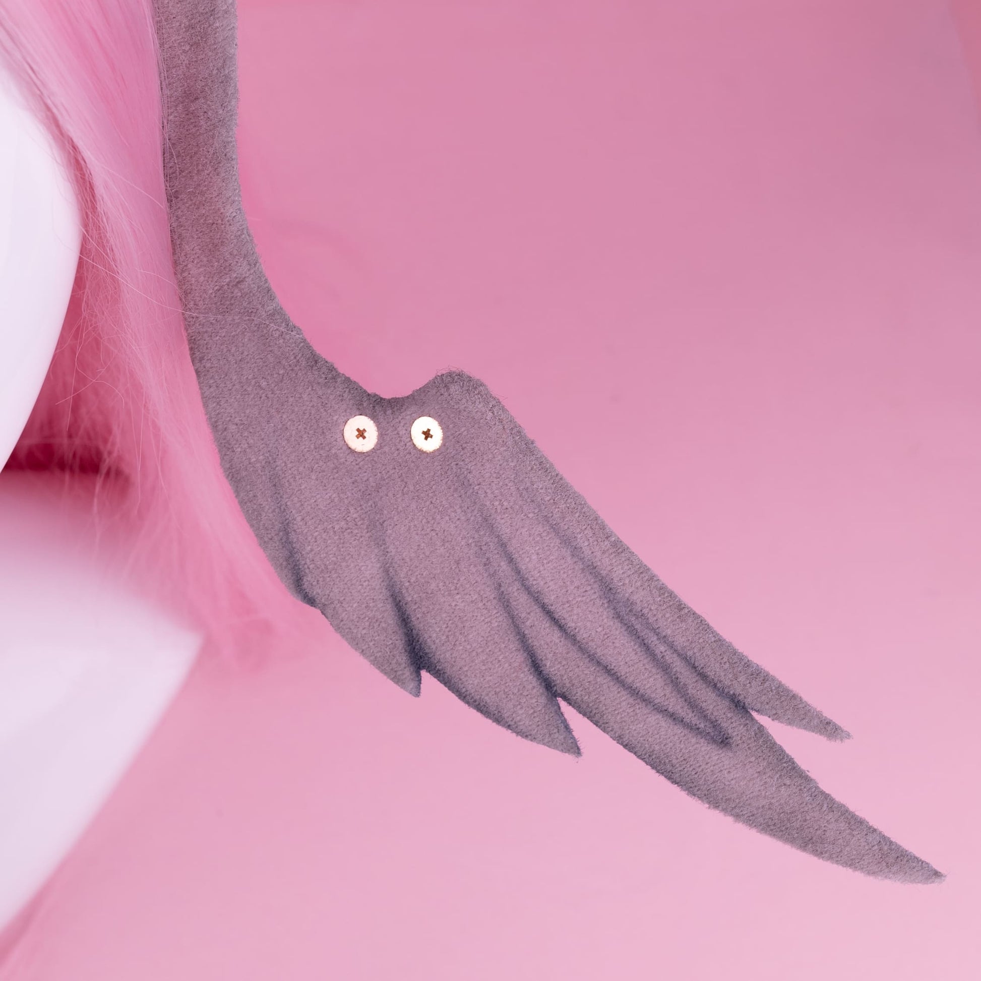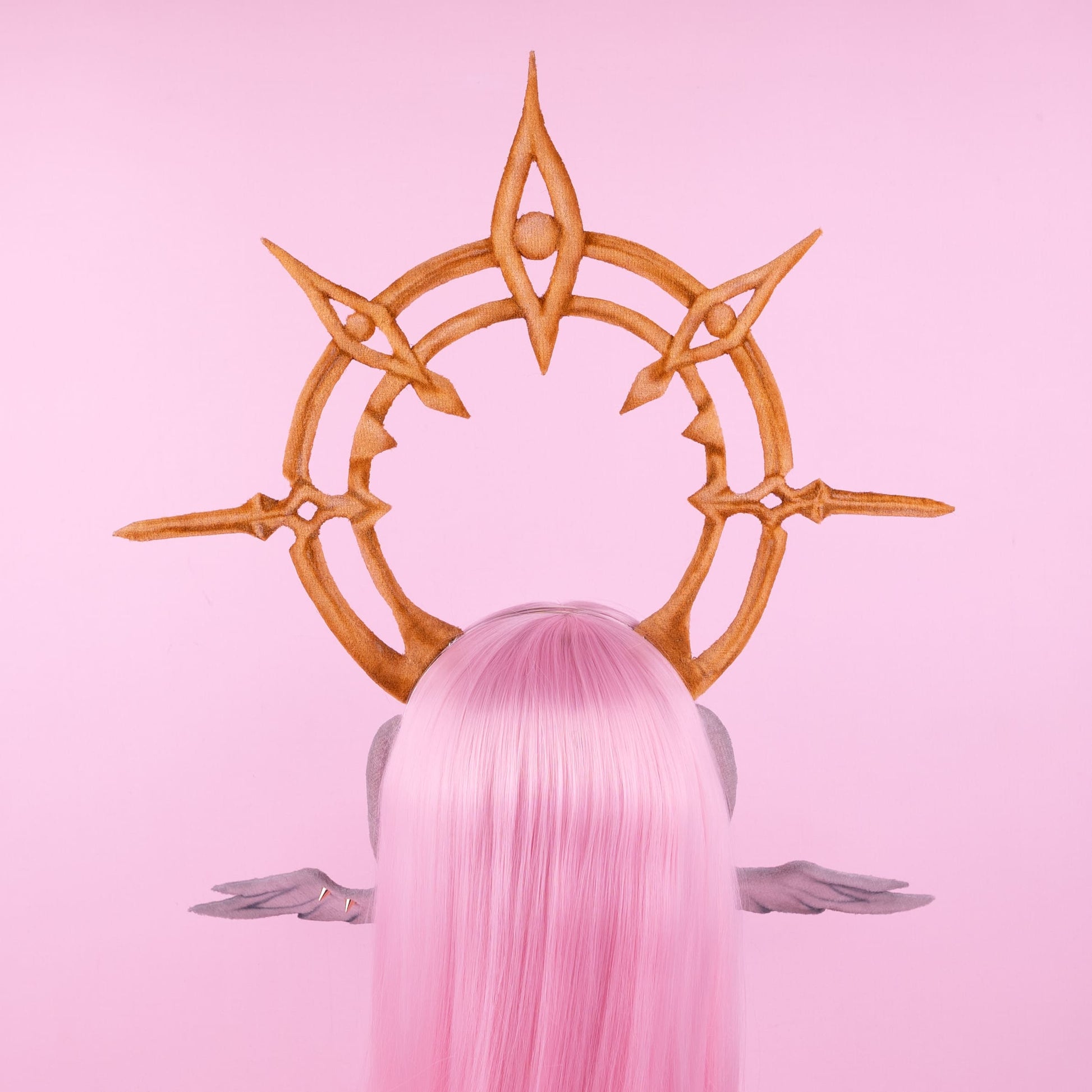 Grey ears, approximately 4 inches, decorated with airbrushing. Ears are fully wired and posable on a metal headband. Removable golden halo headband, approximately 9 inches, decorated with airbrushing. Both pieces are made of luxury quality faux fur.