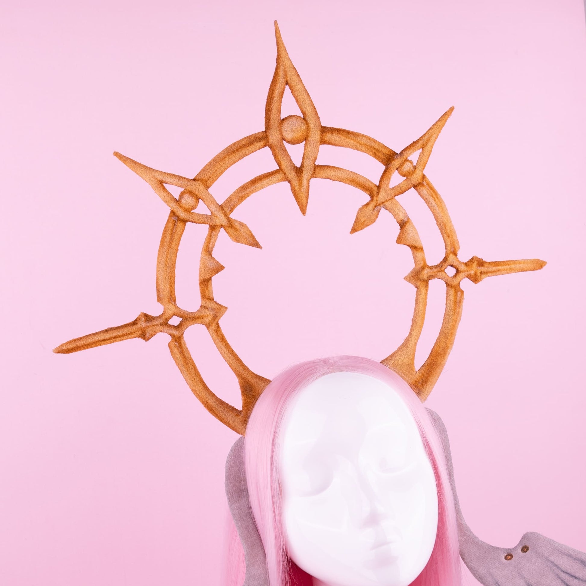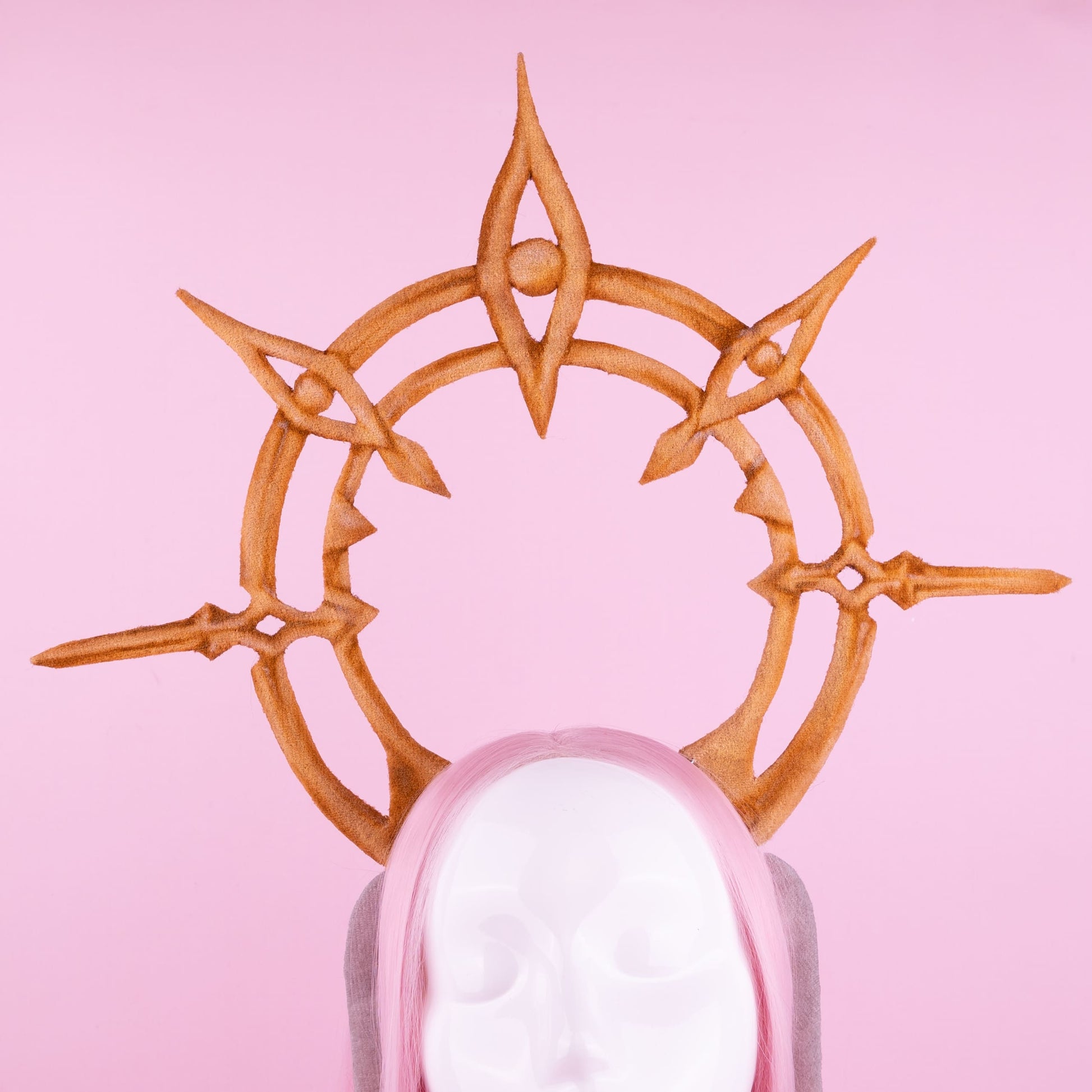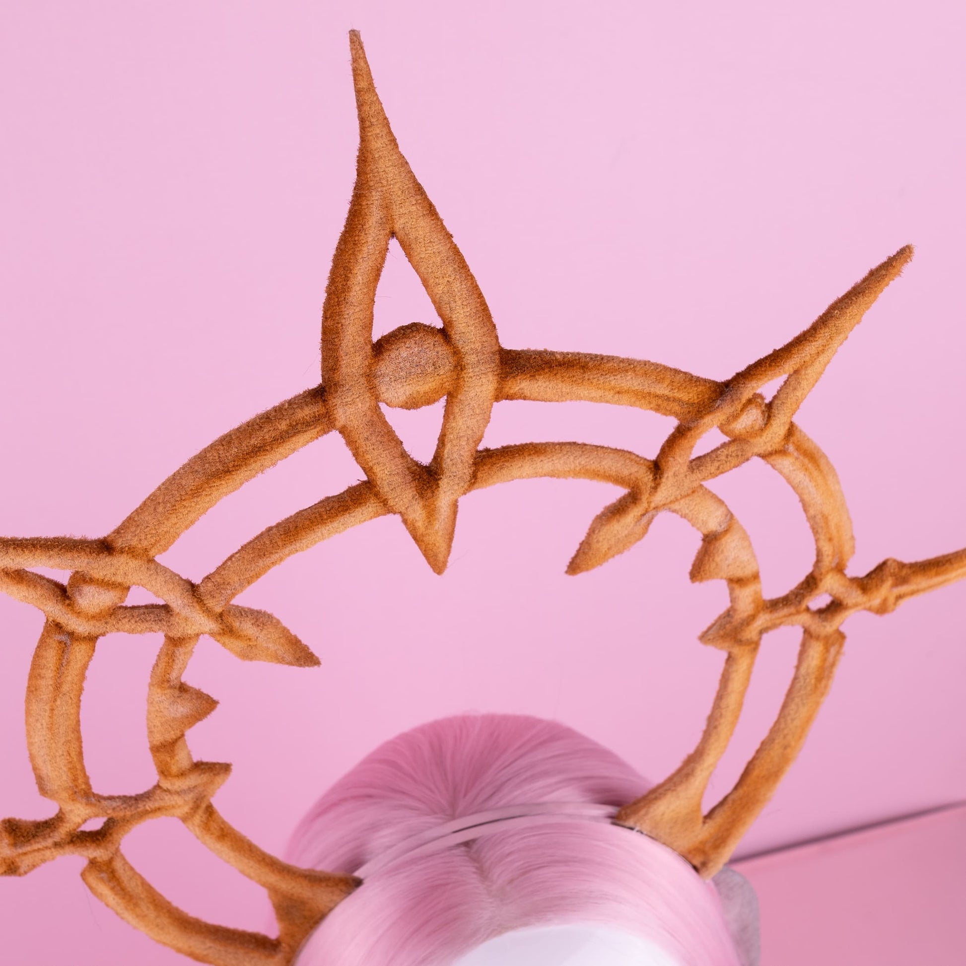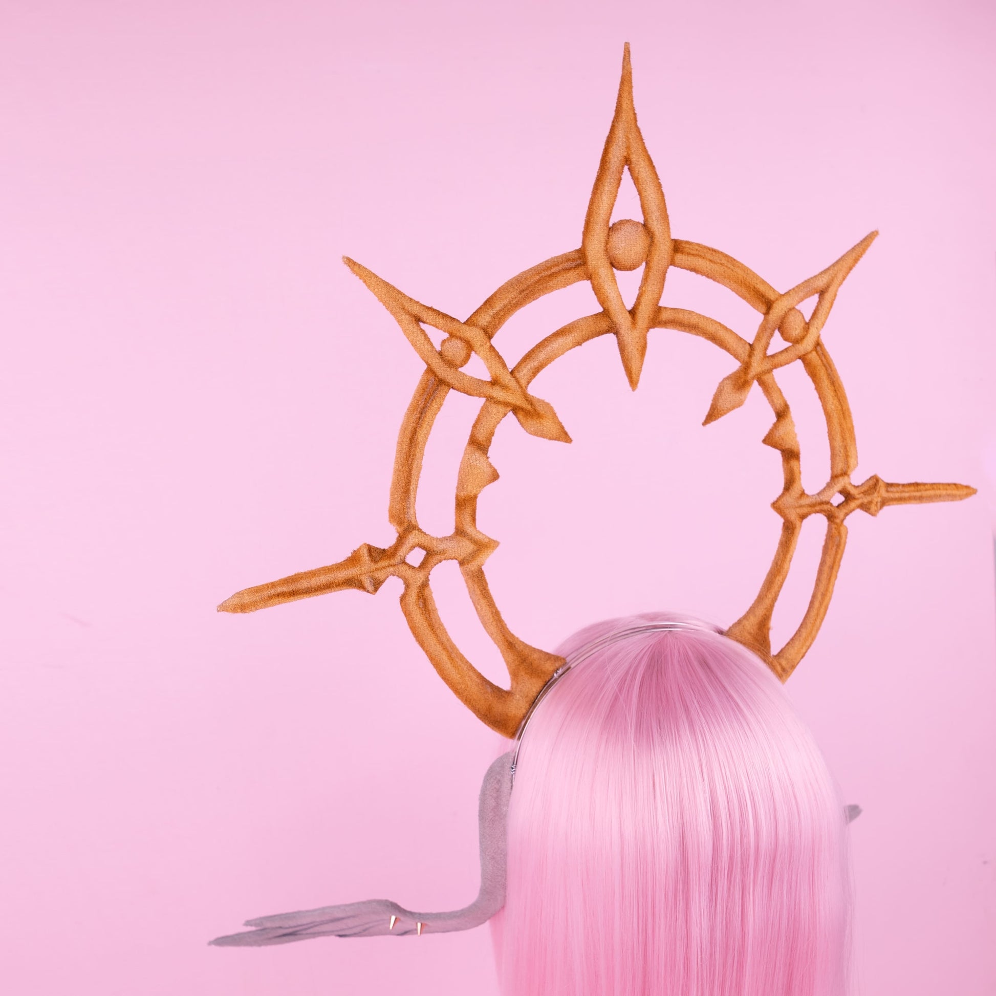 Grey ears, approximately 4 inches, decorated with airbrushing. Ears are fully wired and posable on a metal headband. Removable golden halo headband, approximately 9 inches, decorated with airbrushing. Both pieces are made of luxury quality faux fur.