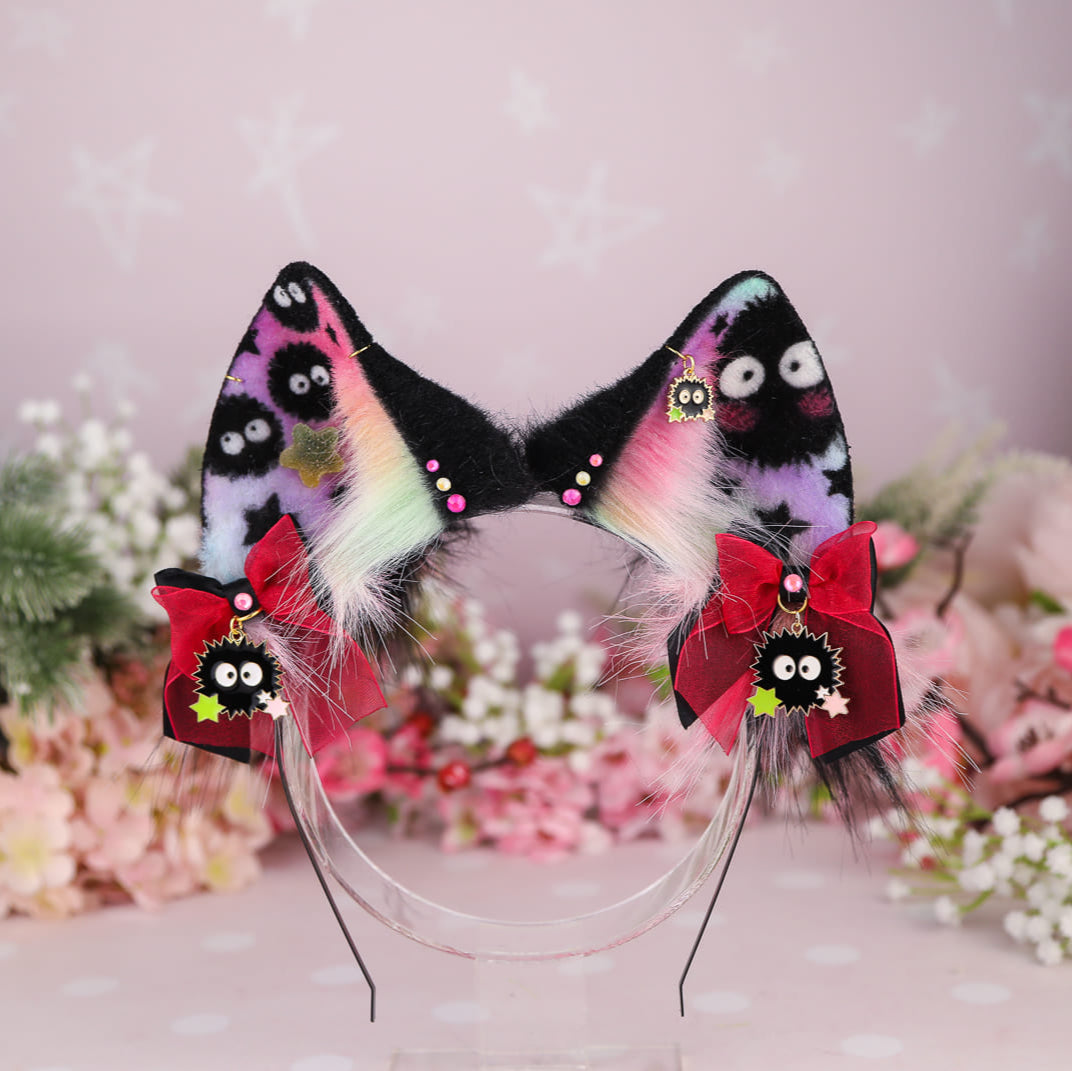 Multicolor fox shaped ears, approximately 3 inches,decorated with rhinestones, metal hoops, cute bows with themed pendants and airbrushing. Ears are fully wired and posable on a metal headband. Made of luxury quality faux fur and crystals.