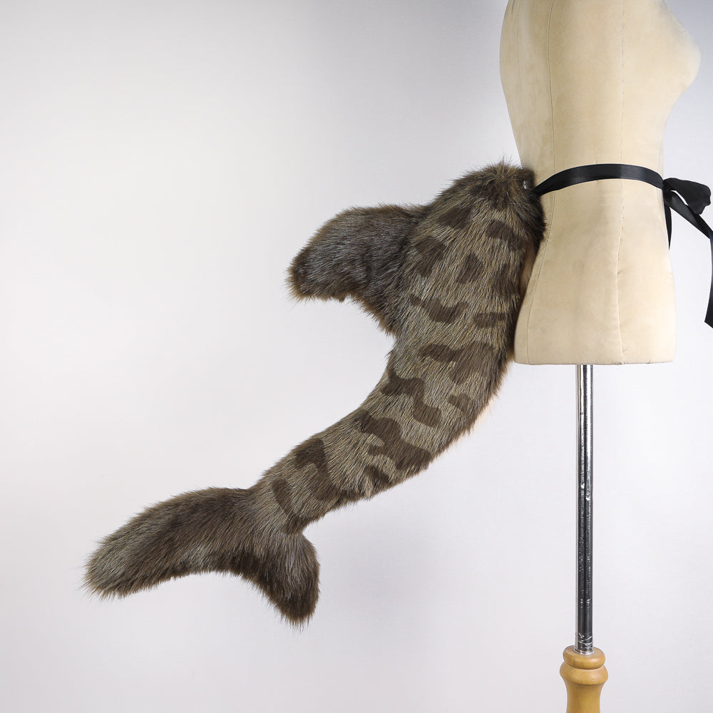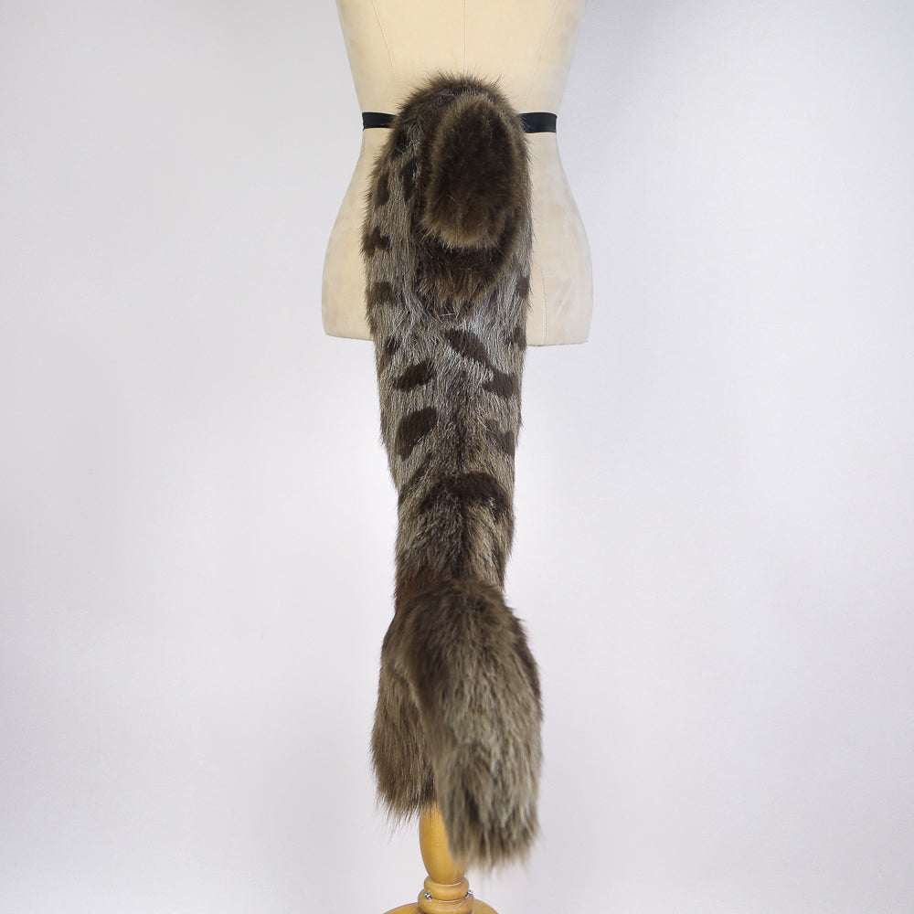 Fluffy tail approximately 33 inches long, made of luxury quality faux fur. Tail is attaching by an elastic belt loop and a doublesided ribbon.