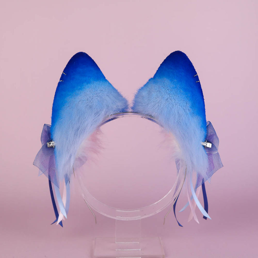 Ears are fully wired and posable on a metal headband. Approximately 3,5 inches tall. We use luxury quality faux fur and crystals. Ears are decorated with piercing hoops and removable winged bows on little alligator clips with pendants.