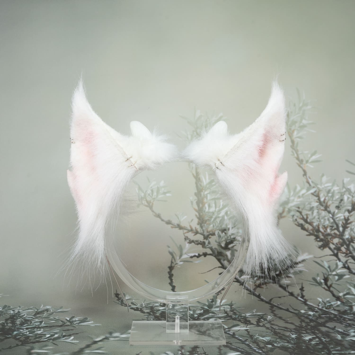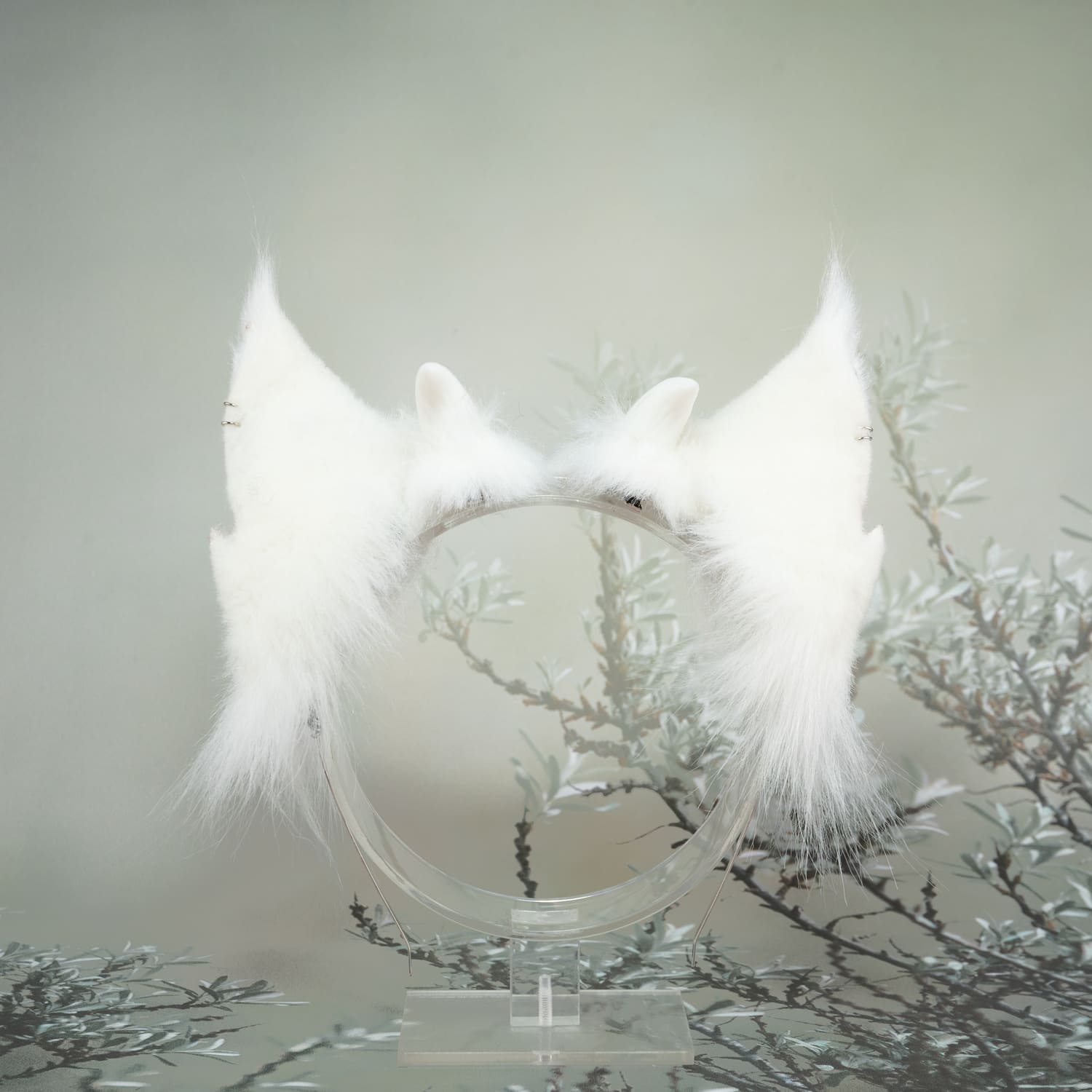 White ears, approximately 2.5 inches, decorated with horns and metal hoops. Ears are fully wired and posable on a metal headband. Made of luxury quality faux fur.