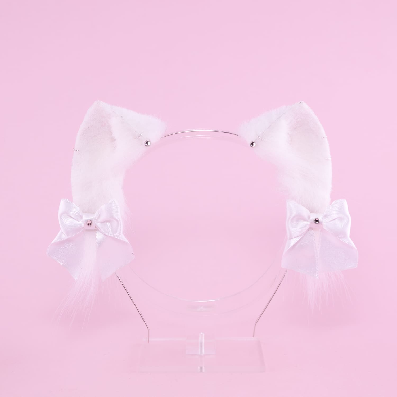 White kitten shaped ears, approximately 2 inches, decorated with rhinestones, metal hoops and cute bows. Ears are fully wired and posable on a metal headband. Made of luxury quality faux fur and crystals.
