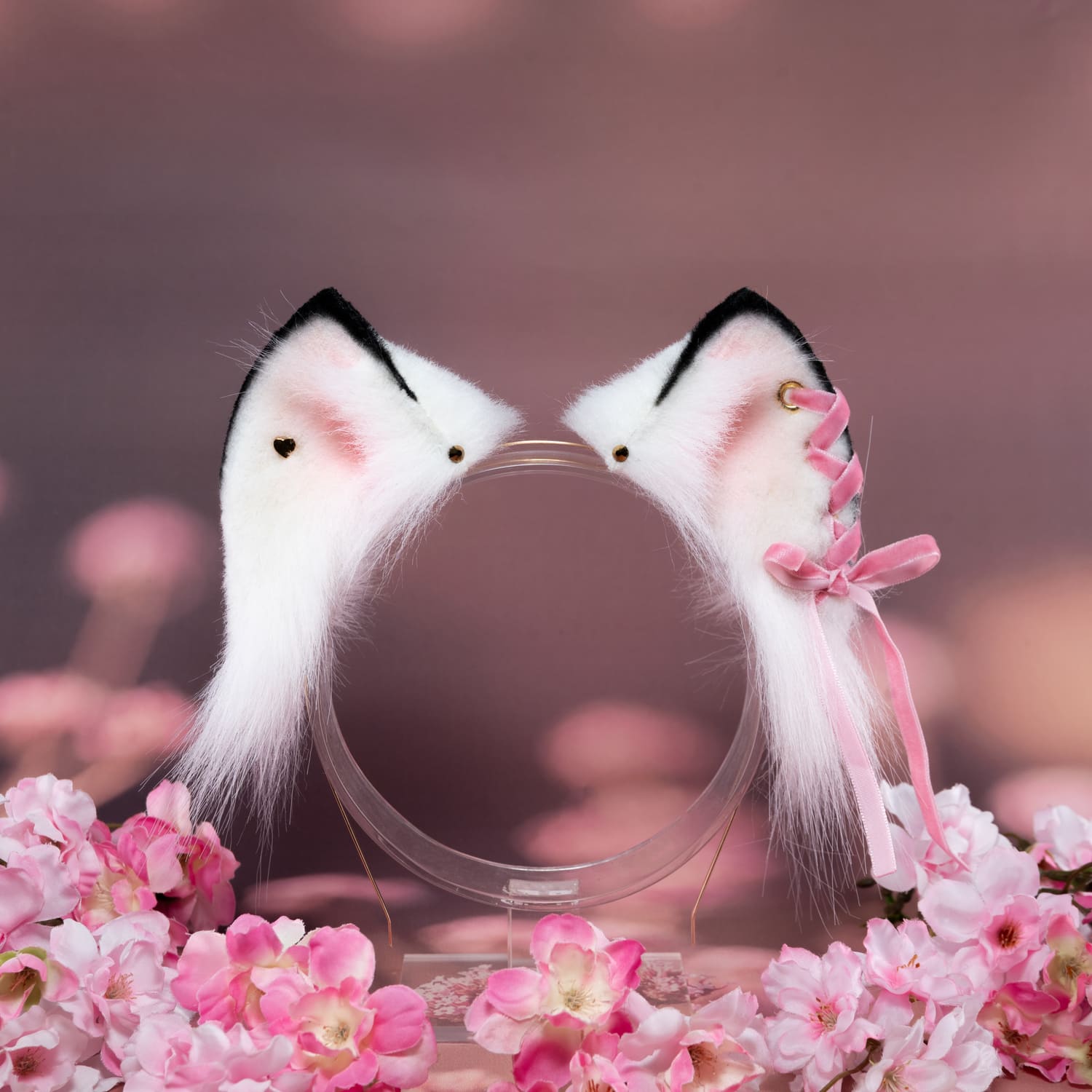 White and pink kitten shaped ears, approximately 2,5 inches, decorated with piercing, rhinestones and decorative lacing. Ears are fully wired and posable on a metal headband. Made of luxury quality faux fur.