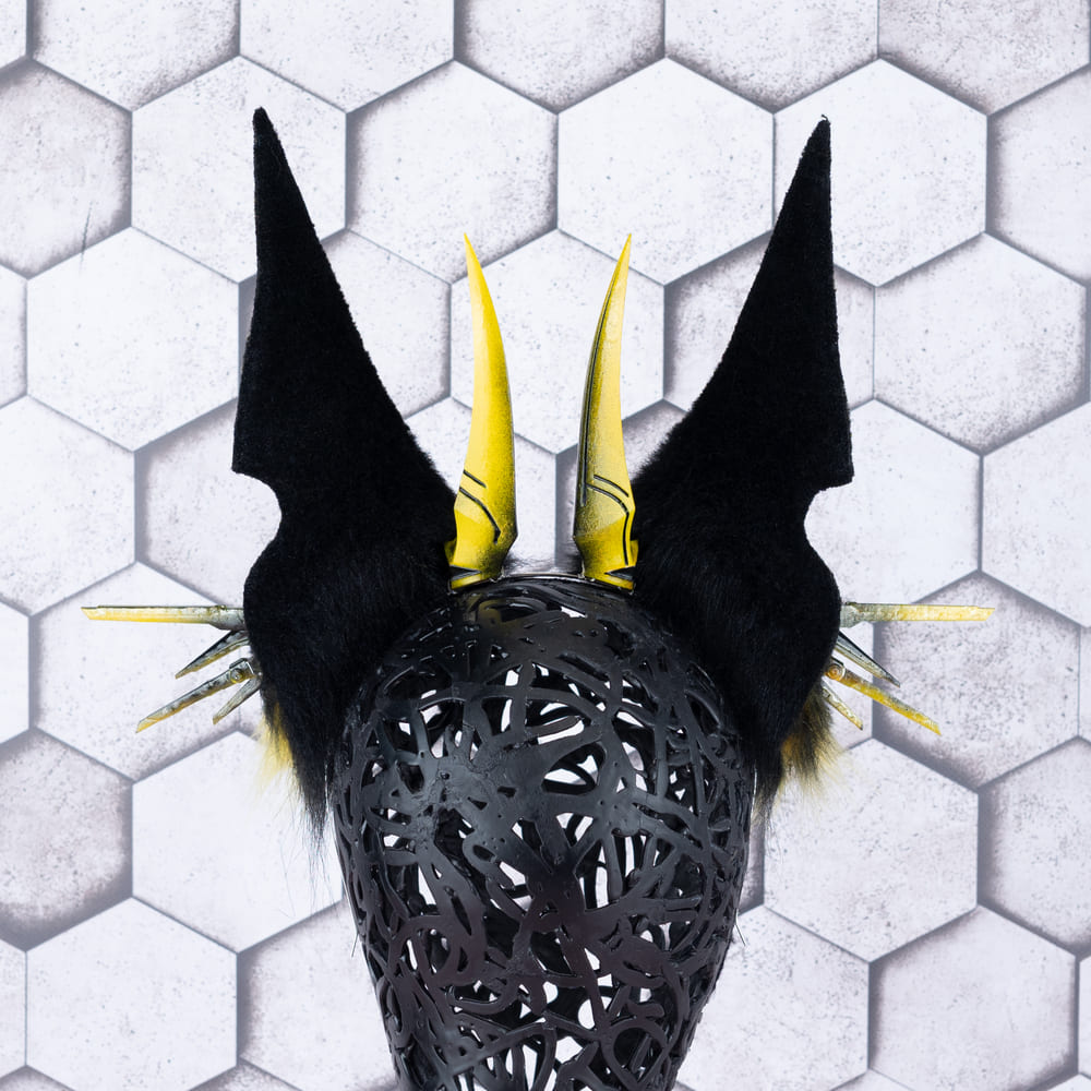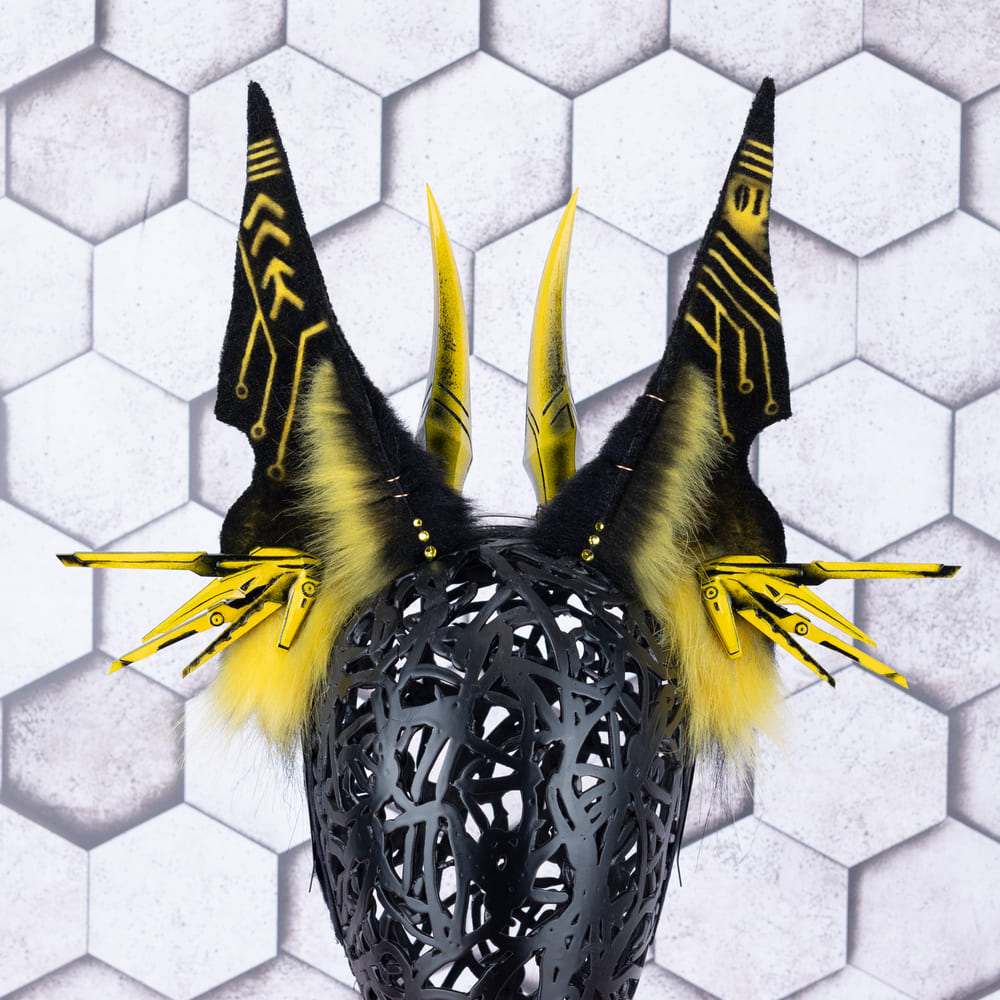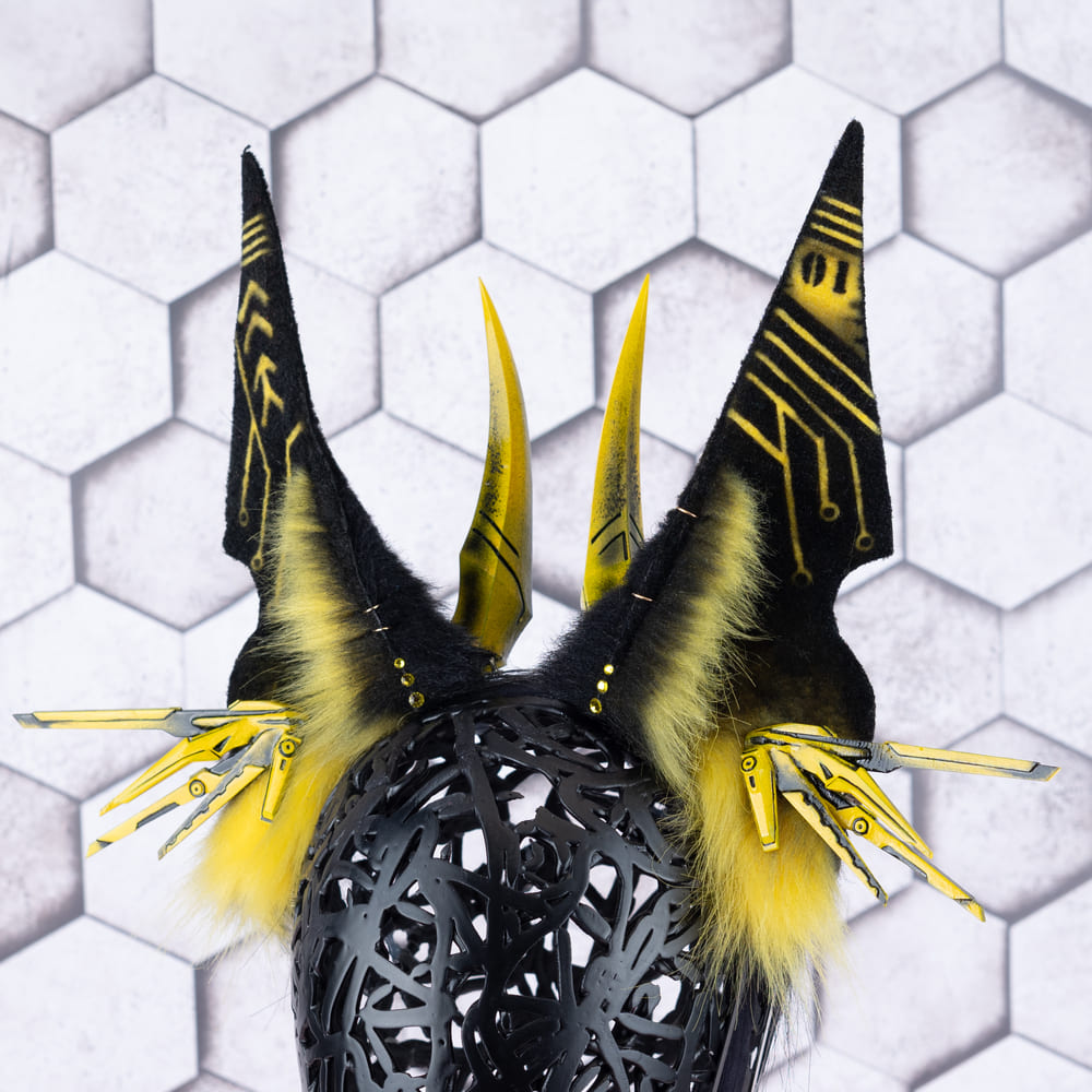 Yellow Anubis ears, approximately 7.5 inches tall, are made of luxury quality faux fur and crystals. Decorated with removable horns, airbrushing, rhinestones and piercing hoops. Fully wired and posable on a metal headband.