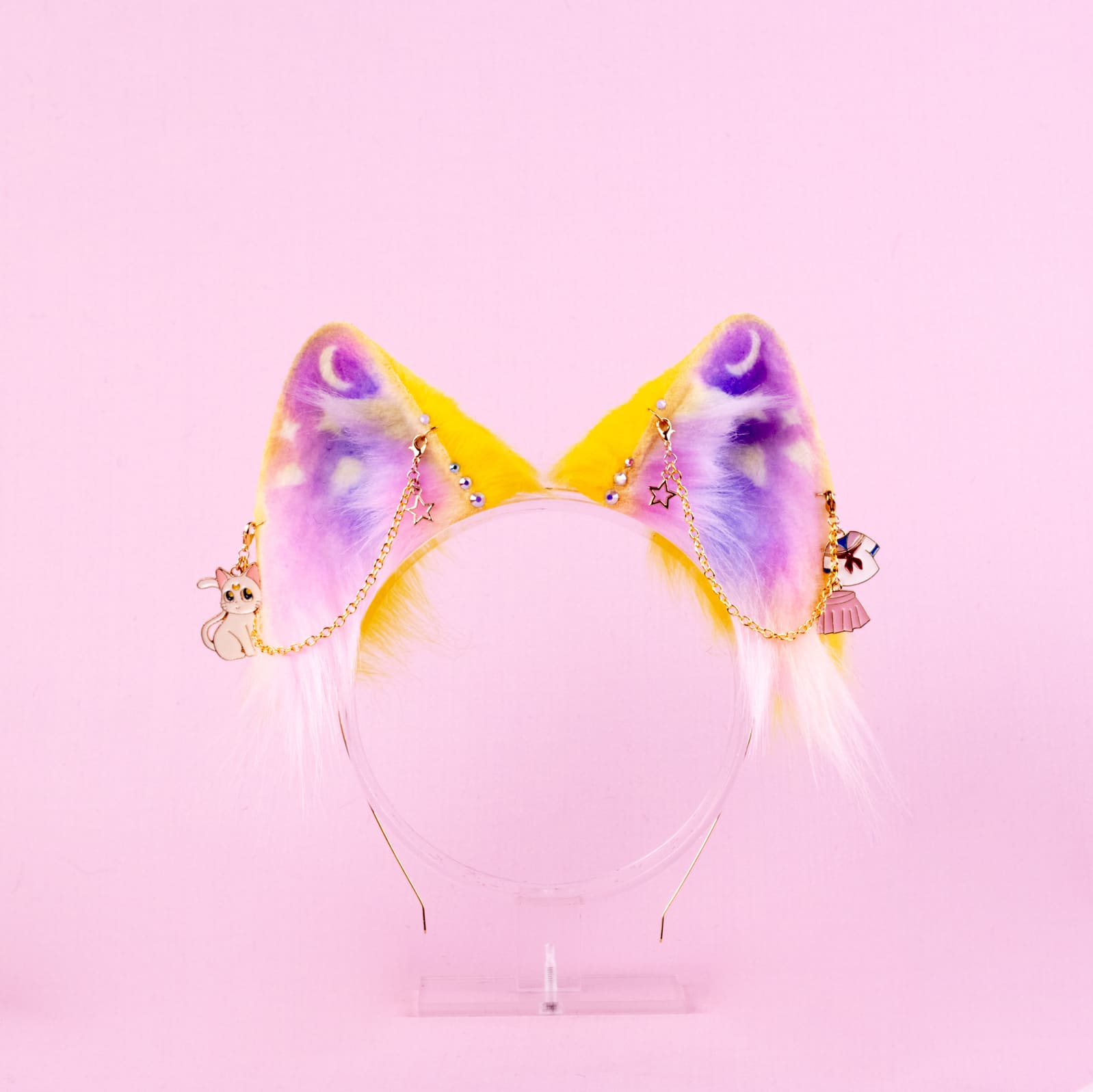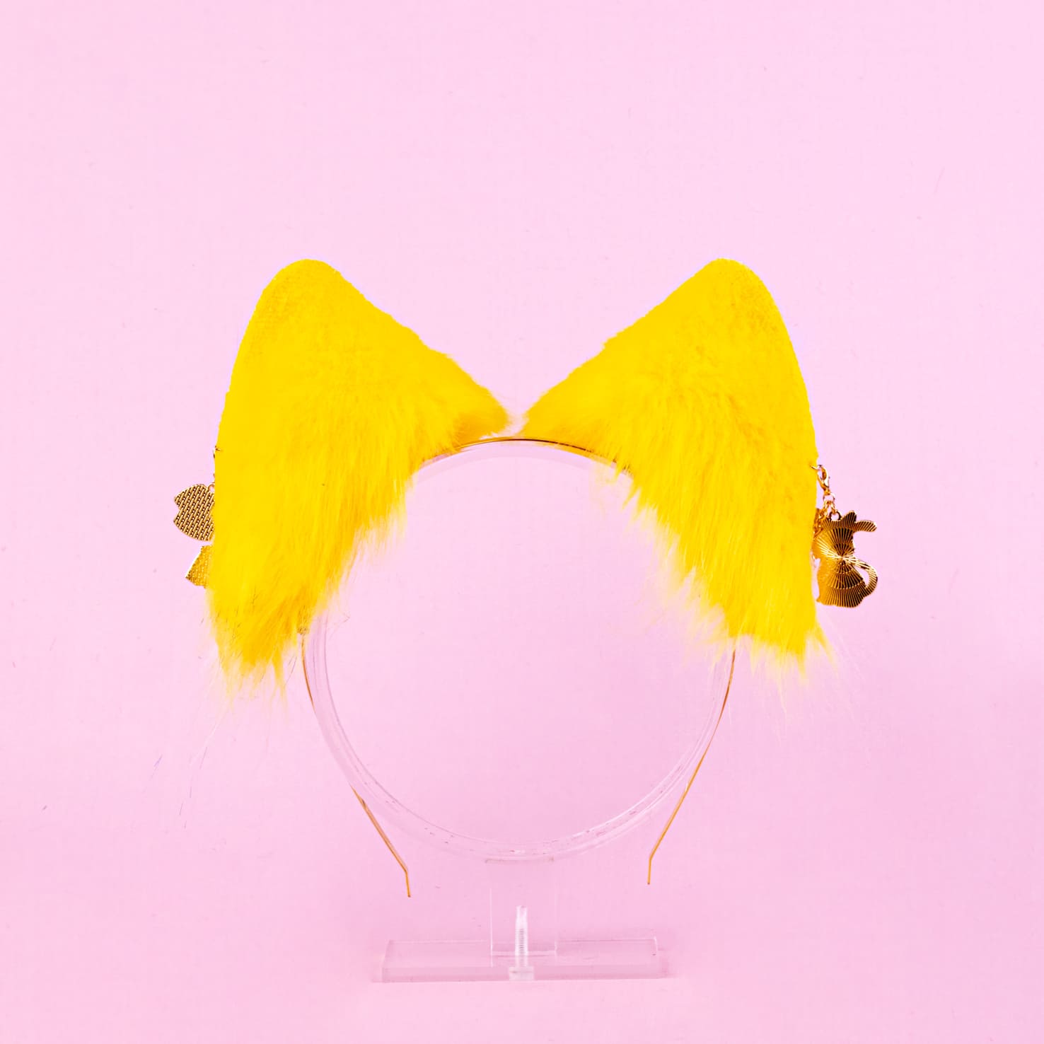 Yellow foxy ears, approximately 3 inches, decorated with airbrushing, piercing, rhinestones, chains and themed pendants. Ears are fully wired and posable on a metal headband. Made of luxury quality faux fur and crystals.